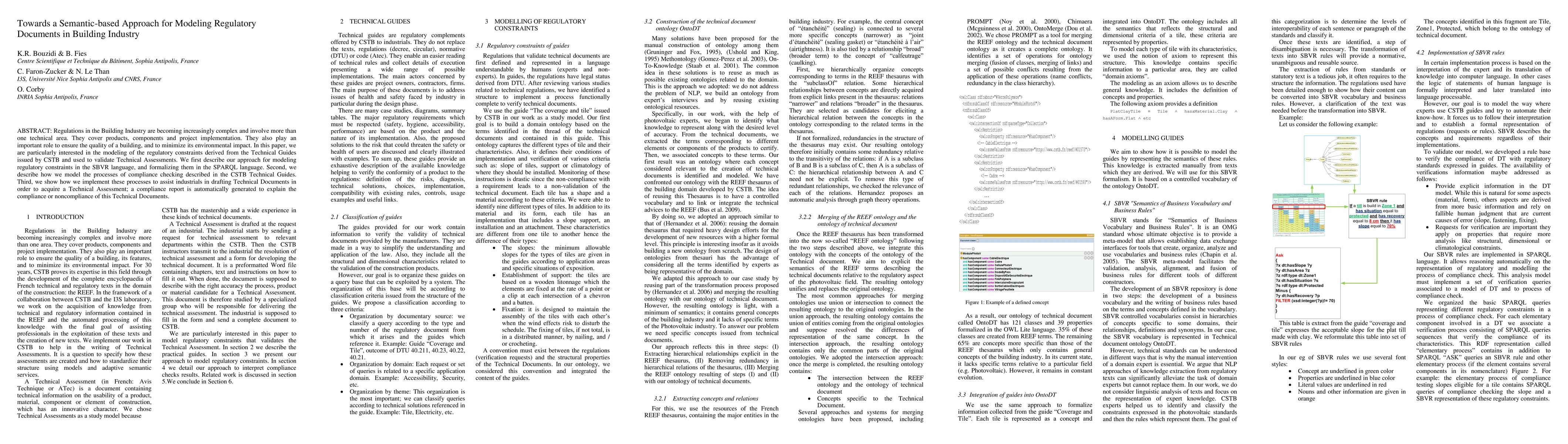 This paper proposes a semantic-based approach to model regulatory constraints from Technical Guides in the building industry using the SBVR and SPARQL languages. It also details the implementation of compliance checking processes to assist industry professionals in drafting Technical Documents and generating automatic compliance reports.