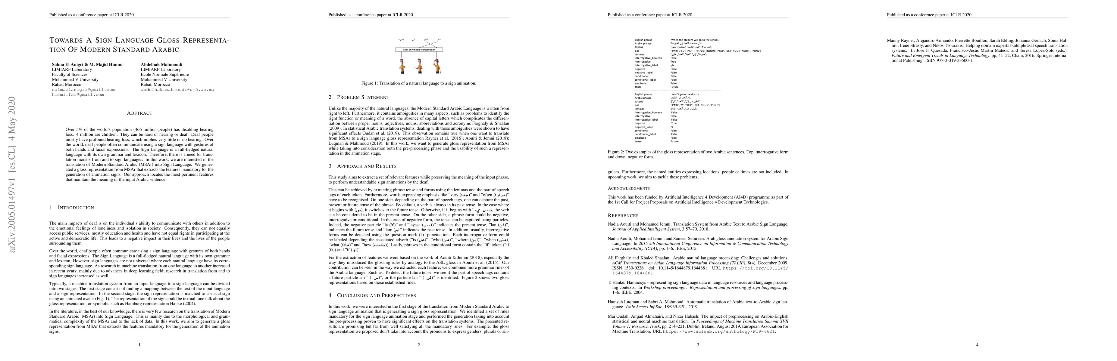 Over 5% of the world's population (466 million people) has disabling hearing loss. 4 million are children. They can be hard of hearing or deaf. Deaf people mostly have profound hearing loss. Which implies very little or no hearing. Over the world, deaf people often communicate using a sign language with gestures of both hands and facial expressions. The sign language is a full-fledged natural language with its own grammar and lexicon. Therefore, there is a need for translation models from and to sign languages. In this work, we are interested in the translation of Modern Standard Arabic(MSAr) into sign language. We generated a gloss representation from MSAr that extracts the features mandatory for the generation of animation signs. Our approach locates the most pertinent features that maintain the meaning of the input Arabic sentence.
