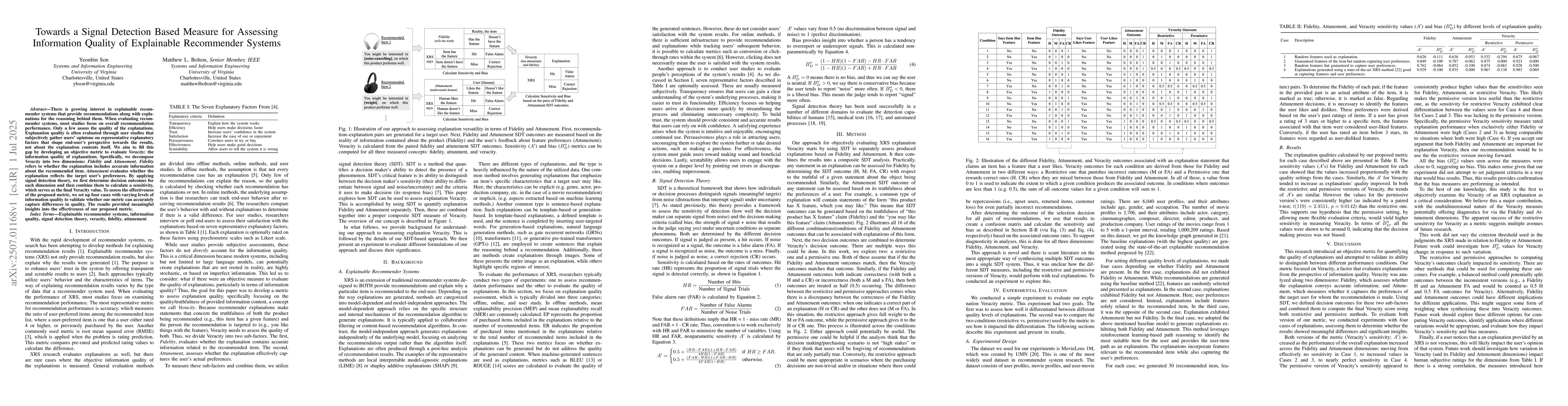 There is growing interest in explainable recommender systems that provide recommendations along with explanations for the reasoning behind them. When evaluating recommender systems, most studies focus on overall recommendation performance. Only a few assess the quality of the explanations. Explanation quality is often evaluated through user studies that subjectively gather users' opinions on representative explanatory factors that shape end-users' perspective towards the results, not about the explanation contents itself. We aim to fill this gap by developing an objective metric to evaluate Veracity: the information quality of explanations. Specifically, we decompose Veracity into two dimensions: Fidelity and Attunement. Fidelity refers to whether the explanation includes accurate information about the recommended item. Attunement evaluates whether the explanation reflects the target user's preferences. By applying signal detection theory, we first determine decision outcomes for each dimension and then combine them to calculate a sensitivity, which serves as the final Veracity value. To assess the effectiveness of the proposed metric, we set up four cases with varying levels of information quality to validate whether our metric can accurately capture differences in quality. The results provided meaningful insights into the effectiveness of our proposed metric.