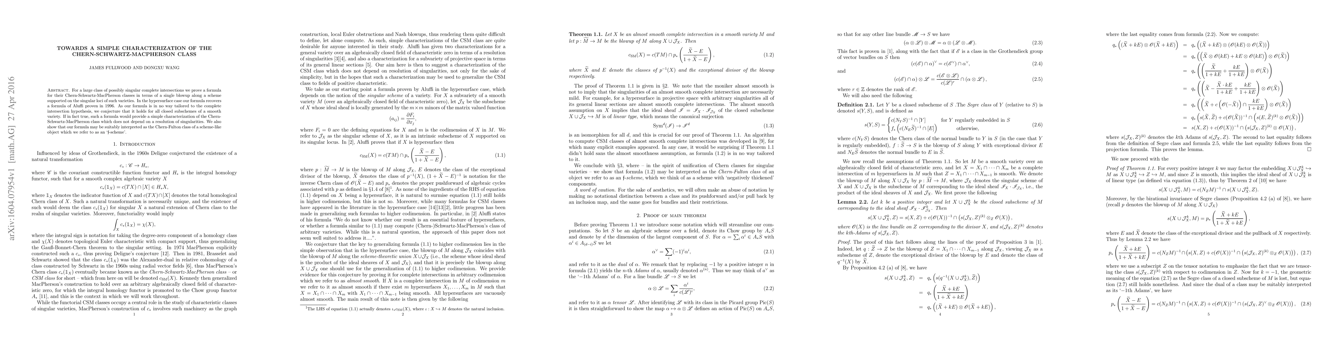 The paper introduces a novel approach to characterizing the Chern-Schwartz-MacPherson class using a single blowup and relates it to the Chern-Fulton class of an f-scheme.