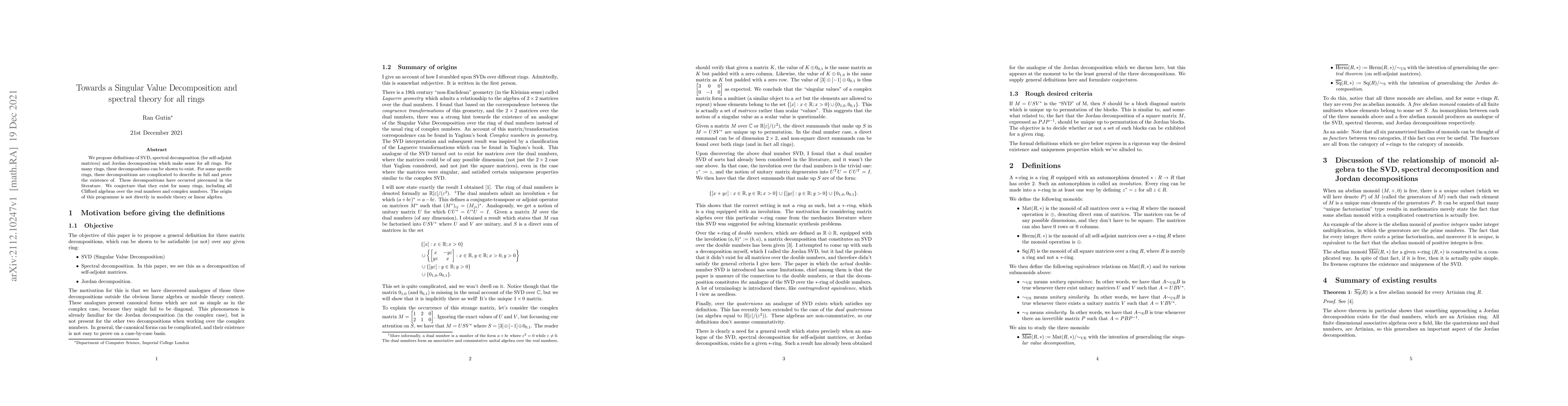 We propose definitions of SVD, spectral decomposition (for self-adjoint matrices) and Jordan decomposition which make sense for all rings. For many rings, these decompositions can be shown to exist. For some specific rings, these decompositions are complicated to describe in full and prove the existence of. These decompositions have occurred piecemeal in the literature. We conjecture that they exist for many rings, including all Clifford algebras over the real numbers and complex numbers. The origin of this programme is not directly in module theory or linear algebra.