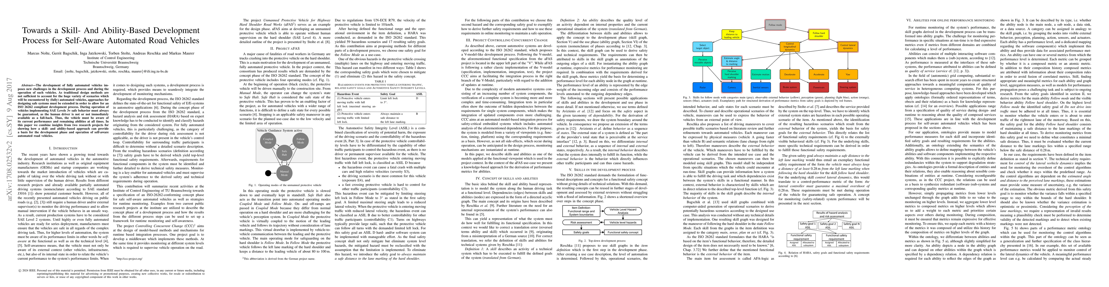 This paper explores the development of fully automated road vehicles using a skill- and ability-based approach to ensure safety and self-awareness during operation, extending traditional design methods to meet ISO 26262 compliance and guarantee safe behavior at SAE Levels 3+.