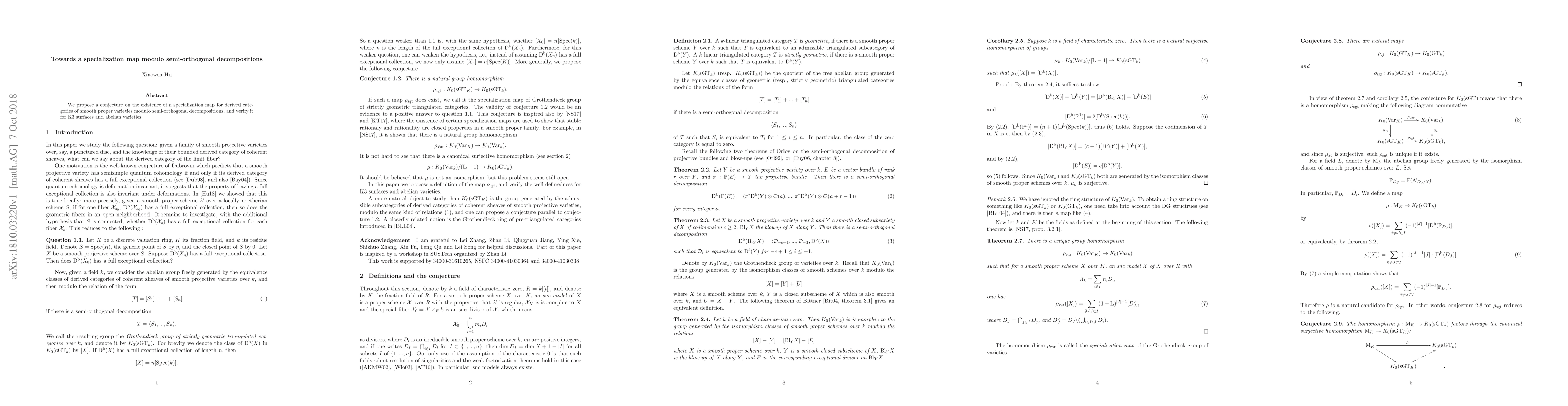 This paper proposes a conjecture regarding the existence of a specialization map for derived categories of smooth proper varieties under semi-orthogonal decompositions, and provides verification for K3 surfaces and abelian varieties.