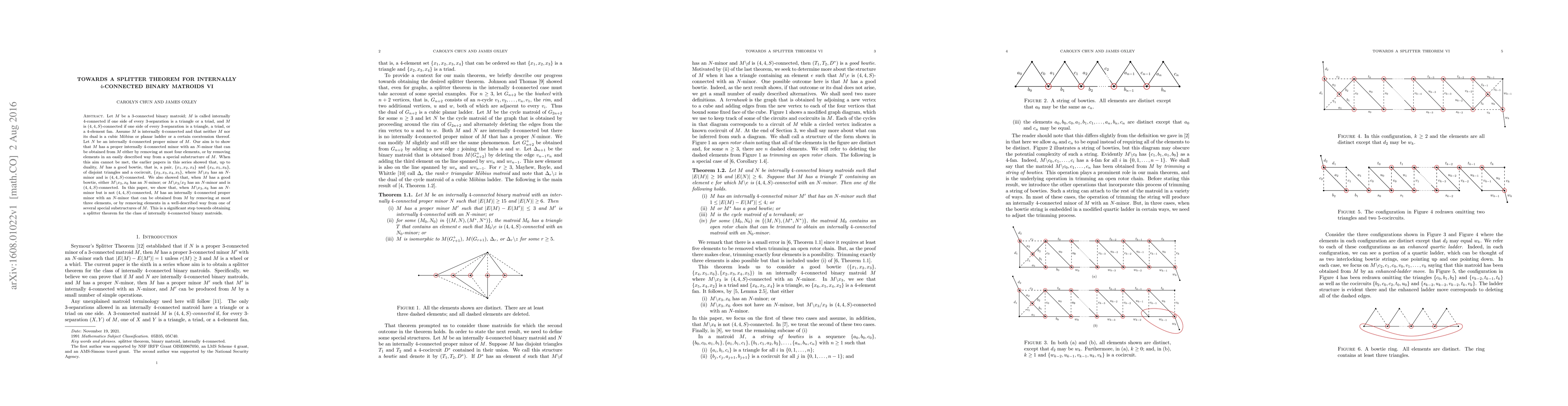 Let $M$ be a $3$-connected binary matroid; $M$ is called internally $4$-connected if one side of every $3$-separation is a triangle or a triad, and $M$ is $(4,4,S)$-connected if one side of every $3$-separation is a triangle, a triad, or a $4$-element fan. Assume $M$ is internally $4$-connected and that neither $M$ nor its dual is a cubic M\"{o}bius or planar ladder or a certain coextension thereof. Let $N$ be an internally $4$-connected proper minor of $M$. Our aim is to show that $M$ has a proper internally $4$-connected minor with an $N$-minor that can be obtained from $M$ either by removing at most four elements, or by removing elements in an easily described way from a special substructure of $M$. When this aim cannot be met, the earlier papers in this series showed that, up to duality, $M$ has a good bowtie, that is, a pair, $\{x_1,x_2,x_3\}$ and $\{x_4,x_5,x_6\}$, of disjoint triangles and a cocircuit, $\{x_2,x_3,x_4,x_5\}$, where $M\backslash x_3$ has an $N$-minor and is $(4,4,S)$-connected. We also showed that, when $M$ has a good bowtie, either $M\backslash x_3,x_6$ has an $N$-minor; or $M\backslash x_3/x_2$ has an $N$-minor and is $(4,4,S)$-connected. In this paper, we show that, when $M\backslash x_3,x_6$ has an $N$-minor but is not $(4,4,S)$-connected, $M$ has an internally $4$-connected proper minor with an $N$-minor that can be obtained from $M$ by removing at most three elements, or by removing elements in a well-described way from one of several special substructures of $M$. This is a significant step towards obtaining a splitter theorem for the class of internally $4$-connected binary matroids.