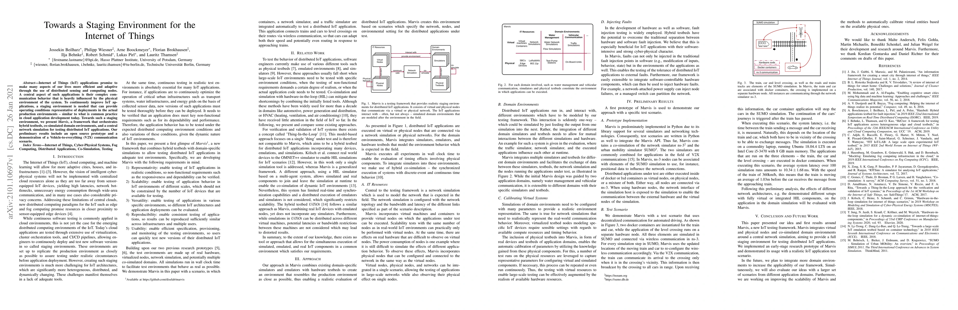The paper proposes Marvis, a framework for creating a staging environment to test IoT applications by orchestrating hybrid testbeds, co-simulated environments, and network simulations. Preliminary results include an open-source prototype and a demonstration of a Vehicle-to-everything (V2X) communication scenario.