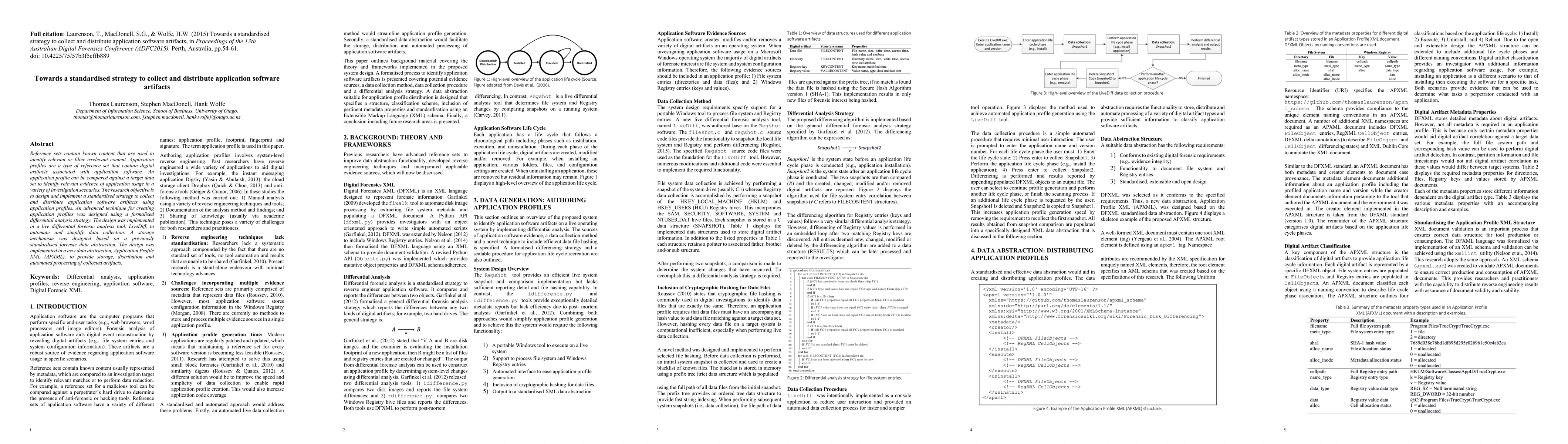 Reference sets contain known content that are used to identify relevant or filter irrelevant content. Application profiles are a type of reference set that contain digital artifacts associated with application software. An application profile can be compared against a target data set to identify relevant evidence of application usage in a variety of investigation scenarios. The research objective is to design and implement a standardised strategy to collect and distribute application software artifacts using application profiles. An advanced technique for creating application profiles was designed using a formalised differential analysis strategy. The design was implemented in a live differential forensic analysis tool, LiveDiff, to automate and simplify data collection. A storage mechanism was designed based on a previously standardised forensic data abstraction. The design was implemented in a new data abstraction, Application Profile XML (APXML), to provide storage, distribution and automated processing of collected artifacts.