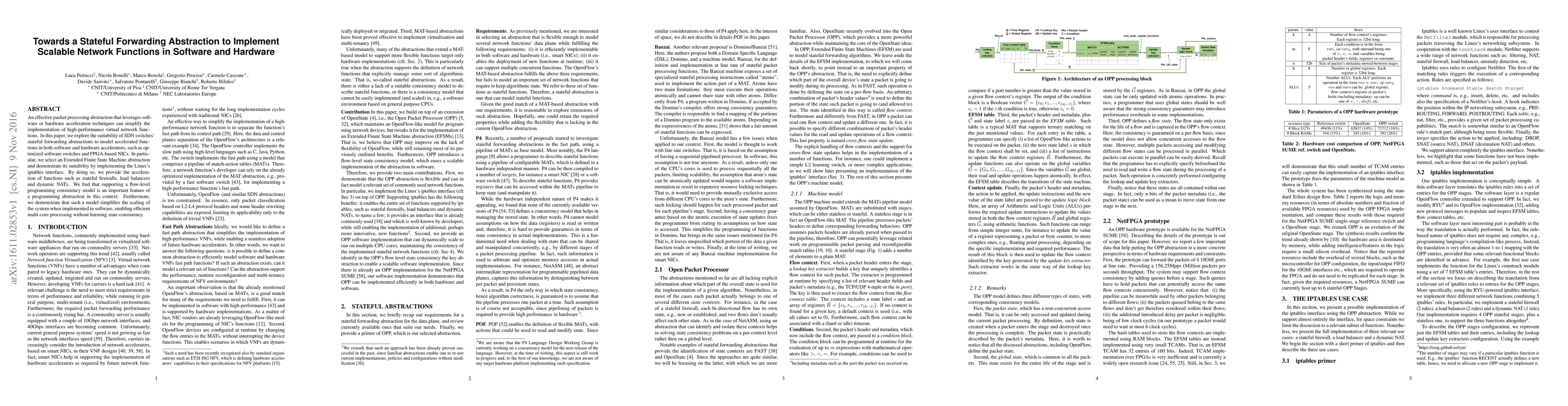 This paper investigates the use of stateful forwarding abstractions in SDN switches to implement scalable network functions, demonstrating the Extended Finite State Machine model through the implementation of Linux's iptables interface. It finds that a flow-level programming consistency model is crucial for efficient multi-core processing and scalability in software.