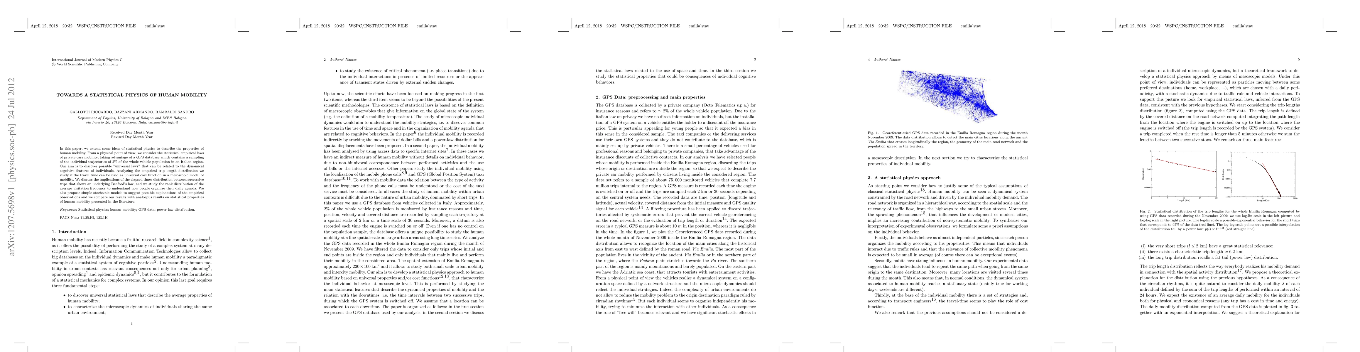 In this paper, we extend some ideas of statistical physics to describe the properties of human mobility. From a physical point of view, we consider the statistical empirical laws of private cars mobility, taking advantage of a GPS database which contains a sampling of the individual trajectories of 2% of the whole vehicle population in an Italian region. Our aim is to discover possible "universal laws" that can be related to the dynamical cognitive features of individuals. Analyzing the empirical trip length distribution we study if the travel time can be used as universal cost function in a mesoscopic model of mobility. We discuss the implications of the elapsed times distribution between successive trips that shows an underlying Benford's law, and we study the rank distribution of the average visitation frequency to understand how people organize their daily agenda. We also propose simple stochastic models to suggest possible explanations of the empirical observations and we compare our results with analogous results on statistical properties of human mobility presented in the literature.