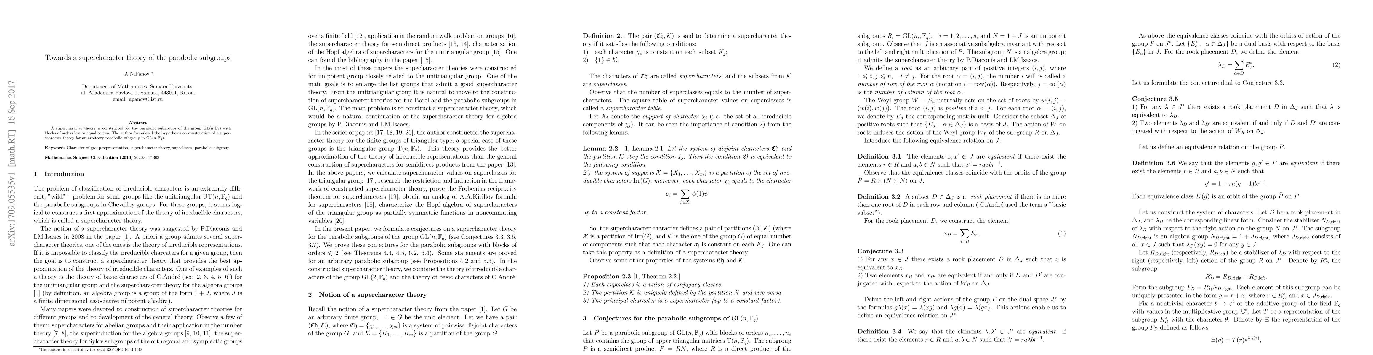 This paper constructs a supercharacter theory for parabolic subgroups of $\mathrm{GL}(n,\Fq)$, focusing on blocks with orders ≤ 2, and proposes hypotheses for extending this theory to any parabolic subgroup in $\mathrm{GL}(n,\Fq)$.
