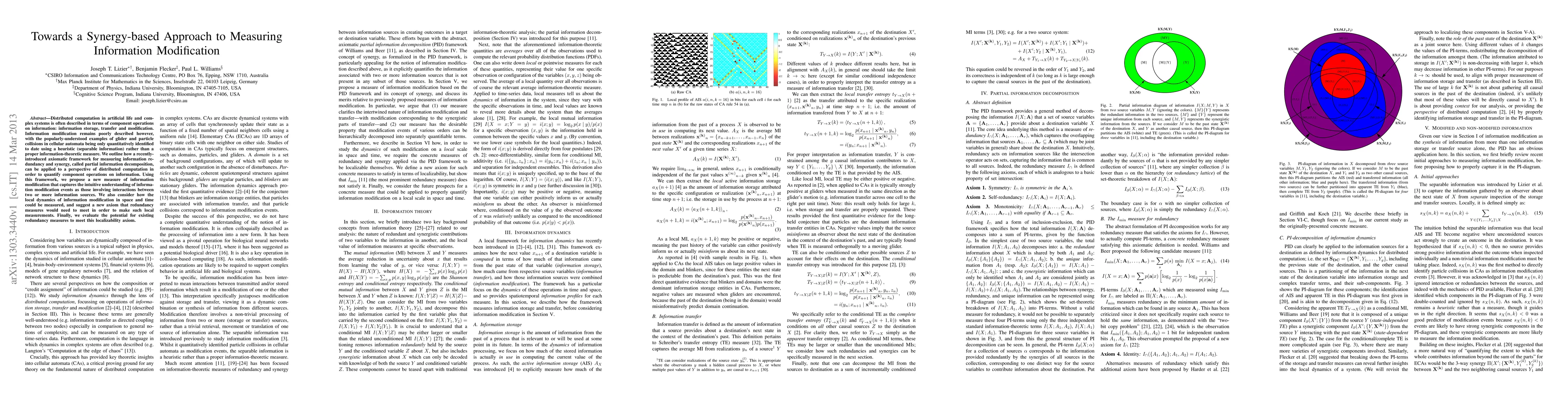 Distributed computation in artificial life and complex systems is often described in terms of component operations on information: information storage, transfer and modification. Information modification remains poorly described however, with the popularly-understood examples of glider and particle collisions in cellular automata being only quantitatively identified to date using a heuristic (separable information) rather than a proper information-theoretic measure. We outline how a recently-introduced axiomatic framework for measuring information redundancy and synergy, called partial information decomposition, can be applied to a perspective of distributed computation in order to quantify component operations on information. Using this framework, we propose a new measure of information modification that captures the intuitive understanding of information modification events as those involving interactions between two or more information sources. We also consider how the local dynamics of information modification in space and time could be measured, and suggest a new axiom that redundancy measures would need to meet in order to make such local measurements. Finally, we evaluate the potential for existing redundancy measures to meet this localizability axiom.