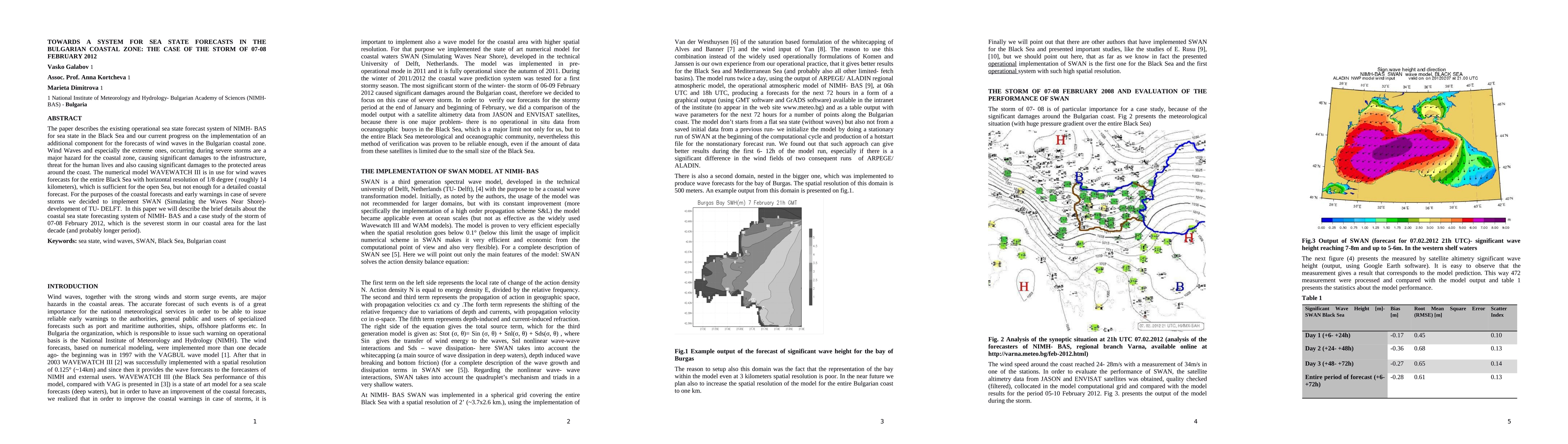This paper discusses the operational sea state forecast system of NIMH-BAS for the Bulgarian Black Sea coastal zone, focusing on the implementation of a new SWAN model for detailed wind wave forecasts during severe storms. A case study of the severe storm on 07-08 February 2012 highlights the system's effectiveness in forecasting extreme weather conditions.