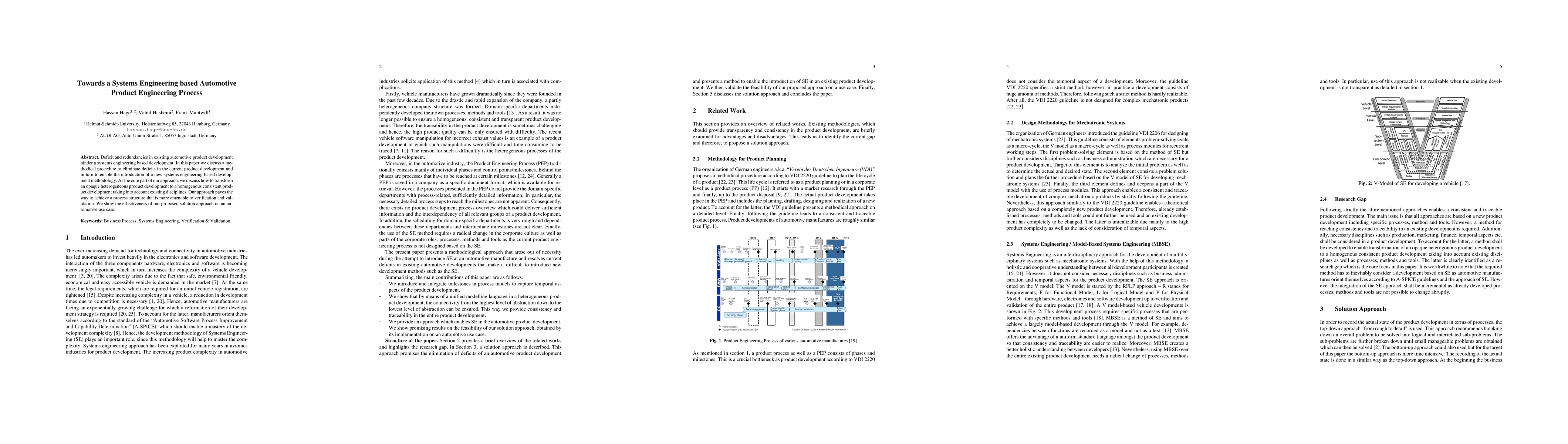 This paper proposes a systems engineering based approach to improve automotive product development, aiming to eliminate existing deficits and create a more consistent and verifiable process. It presents a methodology for transforming current heterogeneous product development into a homogenous and systematic one.