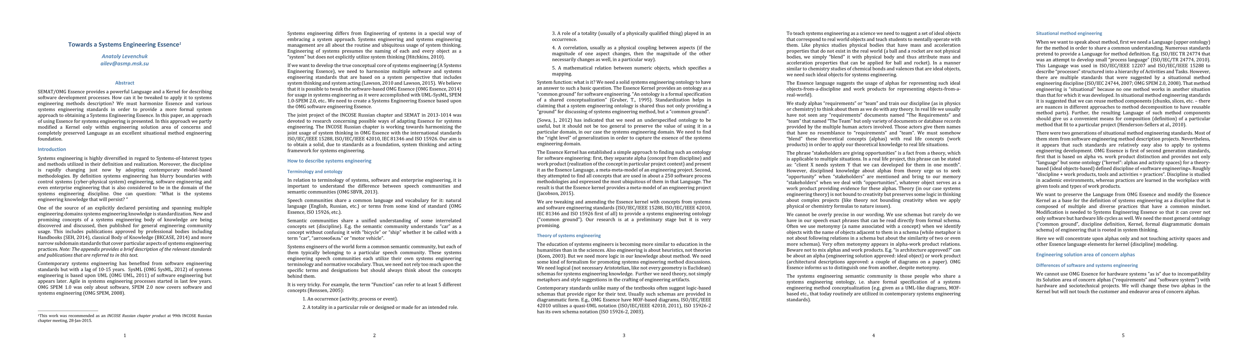 SEMAT/OMG Essence provides a powerful Language and a Kernel for describing software development processes. How can it be tweaked to apply it to systems engineering methods description? We must harmonize Essence and various systems engineering standards in order to provide a more formal system approach to obtaining a Systems Engineering Essence. In this paper, an approach of using Essence for systems engineering is presented. In this approach we partly modified a Kernel only within engineering solution area of concerns and completely preserved Language as an excellent situational method engineering foundation.