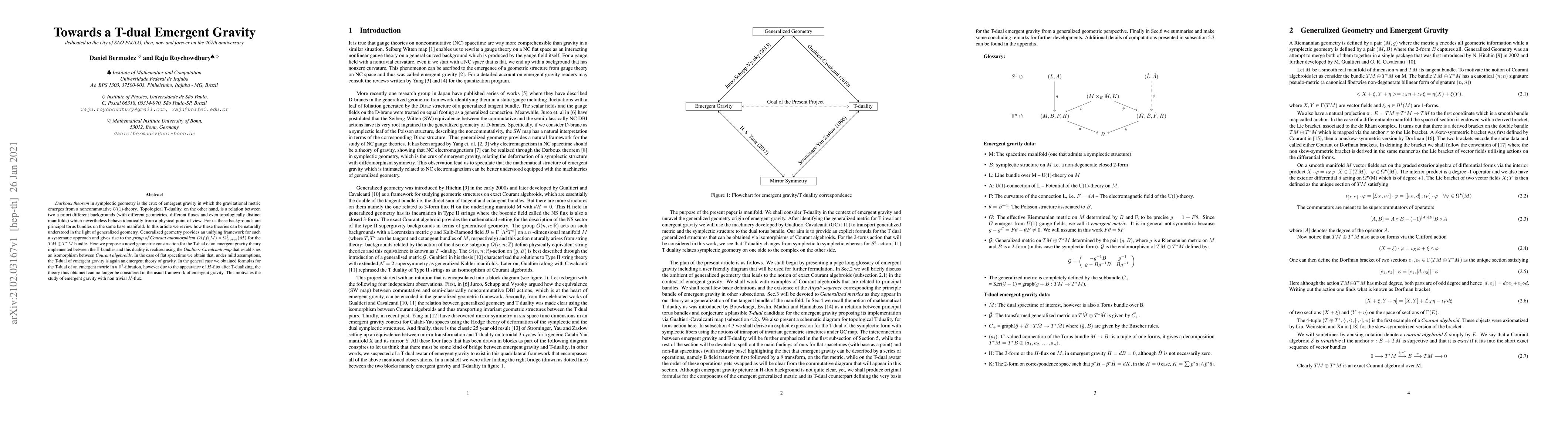 Darboux theorem in symplectic geometry is the crux of emergent gravity in which the gravitational metric emerges from a noncommutative U(1)-theory. Topological T-duality, on the other hand, is a relation between two a priori different backgrounds (with different geometries, different fluxes and even topologically distinct manifolds) which nevertheless behave identically from a physical point of view. For us these backgrounds are principal torus bundles on the same base manifold. In this article we review how these theories can be naturally understood in the light of generalized geometry. Generalized geometry provides an unifying framework for such a systematic approach and gives rise to the group of Courant automorphism $Diff(M) \ltimes \Omega_{closed}^{2}(M)$ for the $TM \oplus T^*M$ bundle. Here we propose a novel geometric construction for the T-dual of an emergent gravity theory implemented between the $\mathbb{T}$-bundles and this duality is realized using the Gualtieri-Cavalcanti map that establishes an isomorphism between Courant algebroids. In the case of flat spacetime we obtain that, under mild assumptions, the T-dual of emergent gravity is again an emergent theory of gravity. In the general case we obtained formulas for the T-dual of an emergent metric in a $\mathbb{T}^2$-fibration, however due to the appearance of H-flux after T-dualizing, the theory thus obtained can no longer be considered in the usual framework of emergent gravity. This motivates the study of emergent gravity with non trivial H-flux.