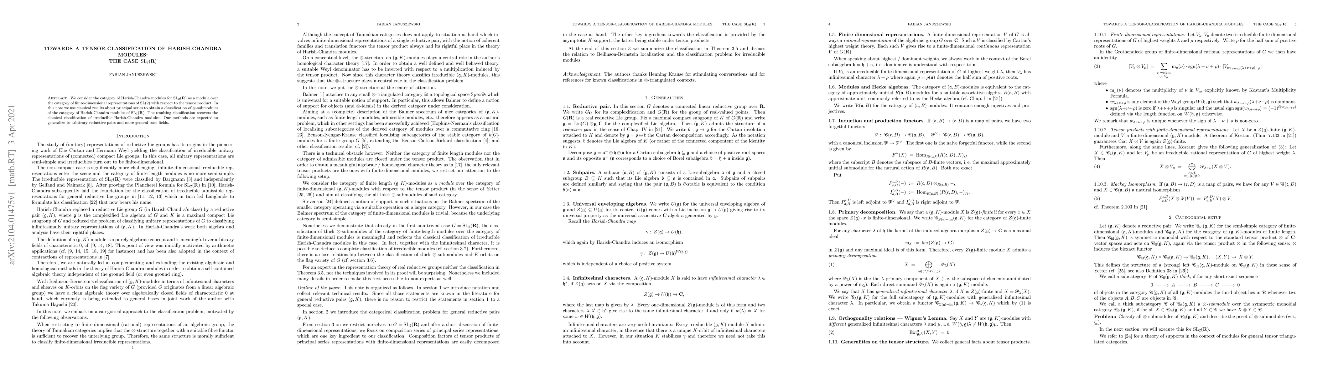 This paper classifies tensor-submodules within the category of Harish-Chandra modules for ${\rm SL}_2(\mathbb R)$, leveraging classical results on principal series, and recovers the classical classification of irreducible Harish-Chandra modules, with potential generalization to broader reductive pairs and fields.
