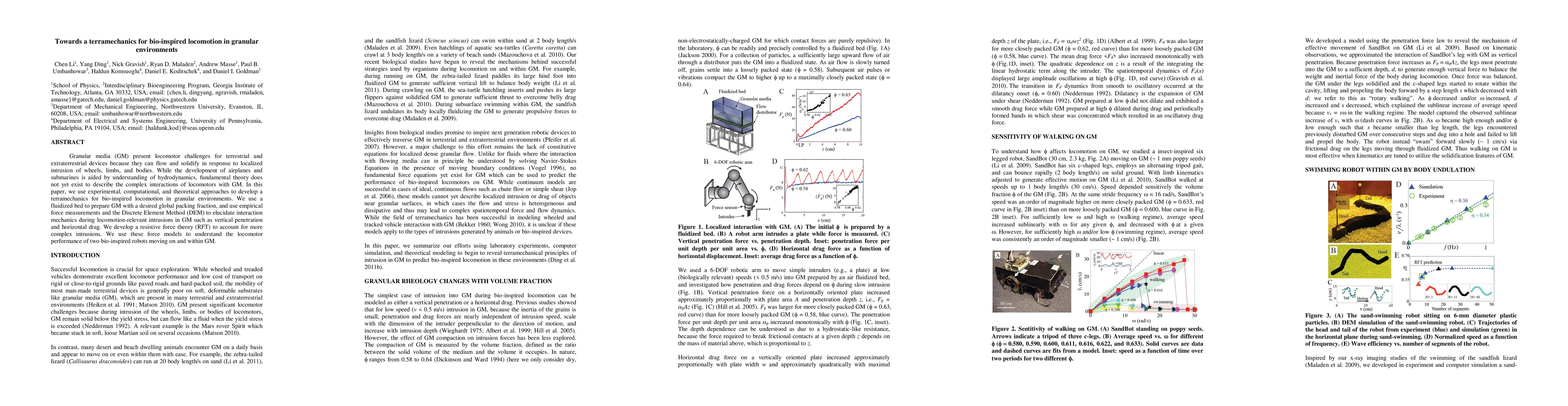 This paper develops a terramechanics framework for bio-inspired locomotion in granular media, using experimental, computational, and theoretical methods to understand the interactions between locomotors and GM. The study employs a resistive force theory to model complex intrusions and evaluates its effectiveness on bio-inspired robots.