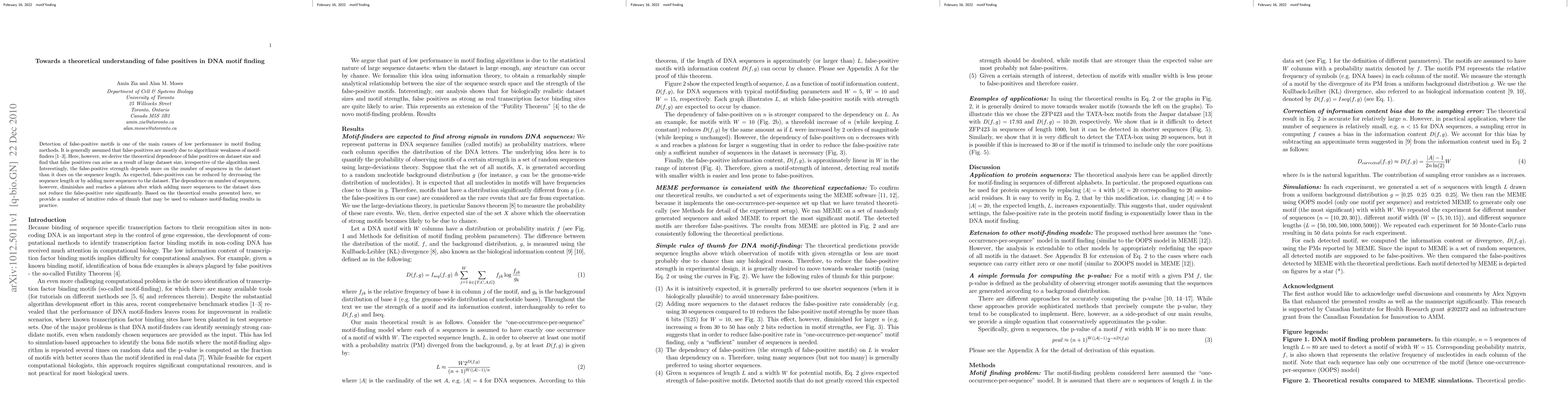 This paper explores the theoretical underpinnings of false positives in DNA motif finding, revealing that false positives are influenced by dataset size rather than solely algorithmic weaknesses. The study finds that the number of sequences in the dataset is more significant than sequence length in determining false-positive rates, suggesting practical guidelines for improving motif-finding accuracy.