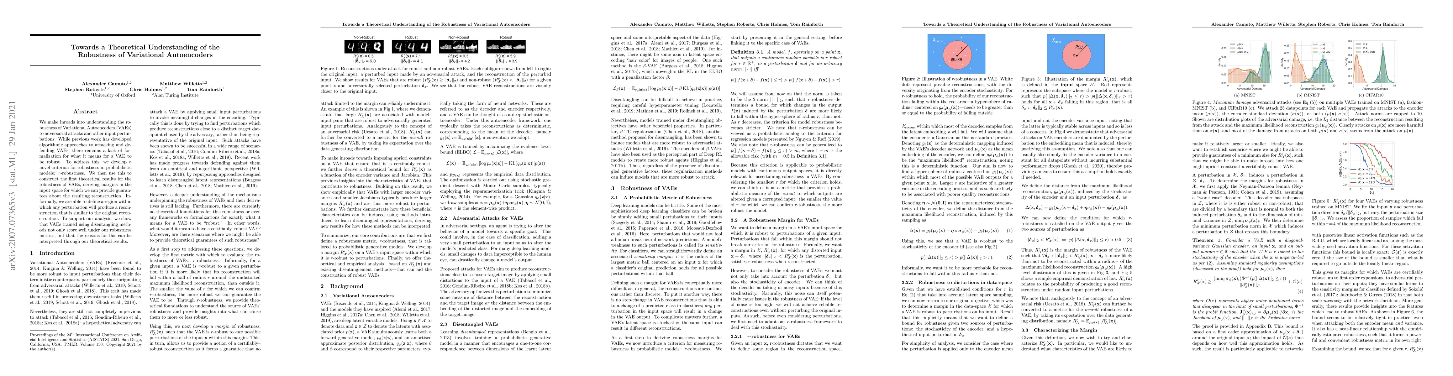 We make inroads into understanding the robustness of Variational Autoencoders (VAEs) to adversarial attacks and other input perturbations. While previous work has developed algorithmic approaches to attacking and defending VAEs, there remains a lack of formalization for what it means for a VAE to be robust. To address this, we develop a novel criterion for robustness in probabilistic models: $r$-robustness. We then use this to construct the first theoretical results for the robustness of VAEs, deriving margins in the input space for which we can provide guarantees about the resulting reconstruction. Informally, we are able to define a region within which any perturbation will produce a reconstruction that is similar to the original reconstruction. To support our analysis, we show that VAEs trained using disentangling methods not only score well under our robustness metrics, but that the reasons for this can be interpreted through our theoretical results.