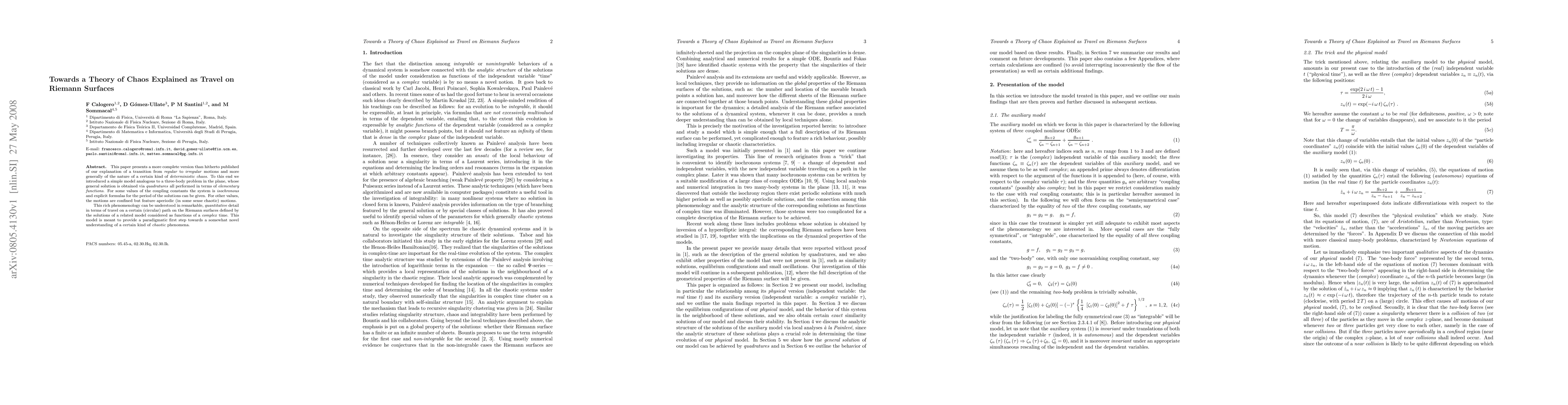 This paper presents a more complete version than hitherto published of our explanation of a transition from regular to irregular motions and more generally of the nature of a certain kind of deterministic chaos. To this end we introduced a simple model analogous to a three-body problem in the plane, whose general solution is obtained via quadratures all performed in terms of elementary functions. For some values of the coupling constants the system is isochronous and explicit formulas for the period of the solutions can be given. For other values, the motions are confined but feature aperiodic (in some sense chaotic) motions. This rich phenomenology can be understood in remarkable, quantitative detail in terms of travel on a certain (circular) path on the Riemann surfaces defined by the solutions of a related model considered as functions of a complex time. This model is meant to provide a paradigmatic first step towards a somewhat novel understanding of a certain kind of chaotic phenomena.