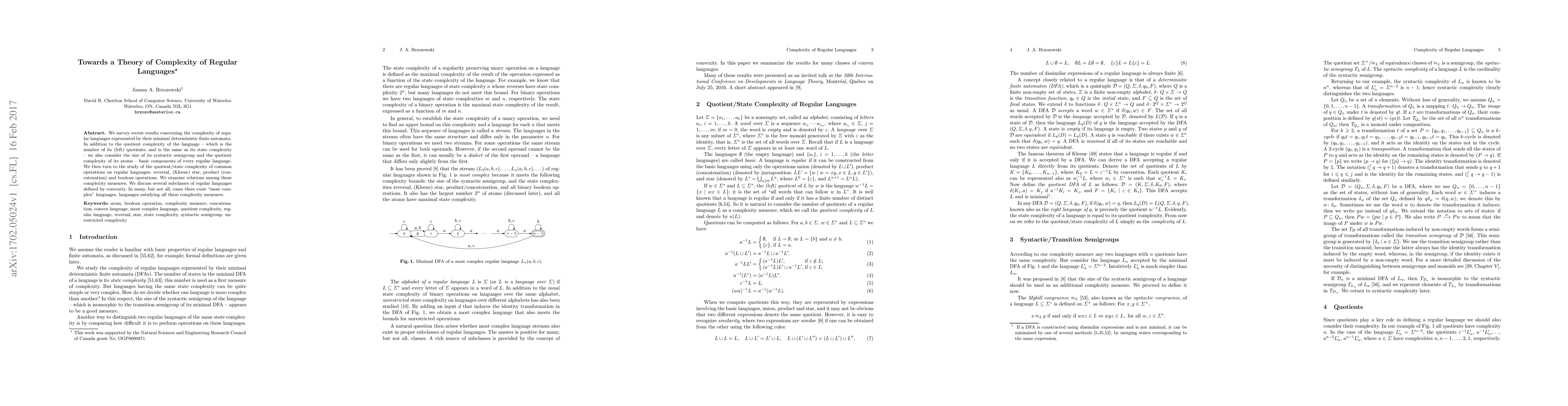We survey recent results concerning the complexity of regular languages represented by their minimal deterministic finite automata. In addition to the quotient complexity of the language -- which is the number of its (left) quotients, and is the same as its state complexity -- we also consider the size of its syntactic semigroup and the quotient complexity of its atoms -- basic components of every regular language. We then turn to the study of the quotient/state complexity of common operations on regular languages: reversal, (Kleene) star, product (concatenation) and boolean operations. We examine relations among these complexity measures. We discuss several subclasses of regular languages defined by convexity. In many, but not all, cases there exist "most complex" languages, languages satisfying all these complexity measures.