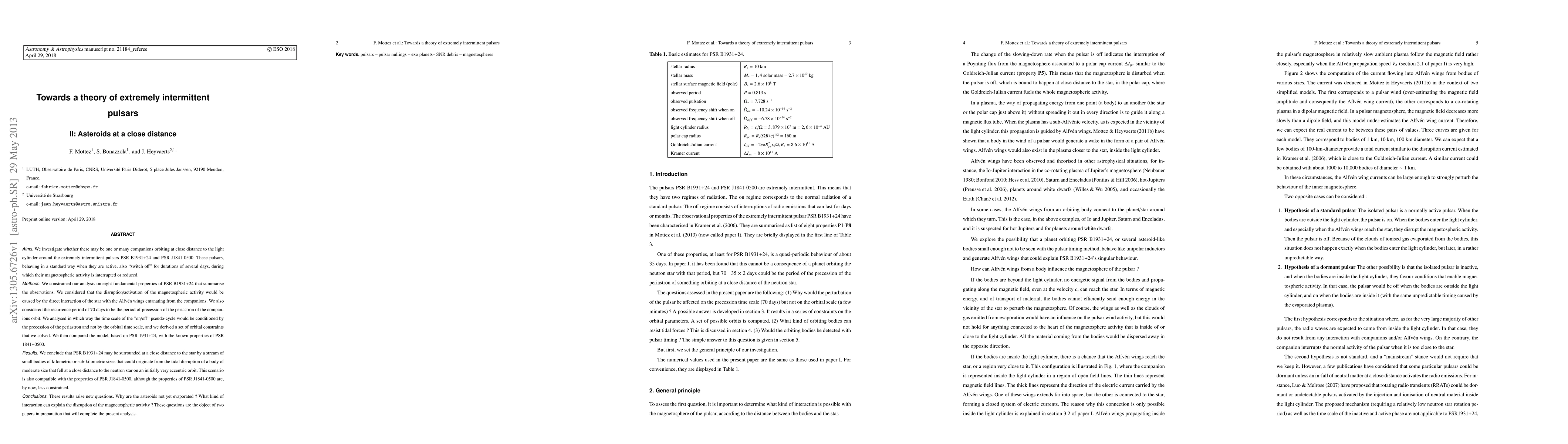 We investigate whether there may be one or many companions orbiting at close distance to the light cylinder around the extremely intermittent pulsars PSR B1931+24 and PSR J1841-0500. These pulsars, behaving in a standard way when they are active, also "switch off" for durations of several days, during which their magnetospheric activity is interrupted or reduced. We constrained our analysis on eight fundamental properties of PSR B1931+24 that summarise the observations. We considered that the disruption/activation of the magnetospheric activity would be caused by the direct interaction of the star with the Alfv\'en wings emanating from the companions. We also considered the recurrence period of 70 days to be the period of precession of the periastron of the companions orbit. We analysed in which way the time scale of the "on/off" pseudo-cycle would be conditioned by the precession of the periastron and not by the orbital time scale, and we derived a set of orbital constraints that we solved. We then compared the model, based on PSR 1931+24, with the known properties of PSR 1841+0500. We conclude that PSR B1931+24 may be surrounded at a close distance to the star by a stream of small bodies of kilometric or sub-kilometric sizes that could originate from the tidal disruption of a body of moderate size that fell at a close distance to the neutron star on an initially very eccentric orbit. This scenario is also compatible with the properties of PSR J1841-0500, although the properties of PSR J1841-0500 are, by now, less constrained. These results raise new questions. Why are the asteroids not yet evaporated ? What kind of interaction can explain the disruption of the magnetospheric activity ? These questions are the object of two papers in preparation that will complete the present analysis.