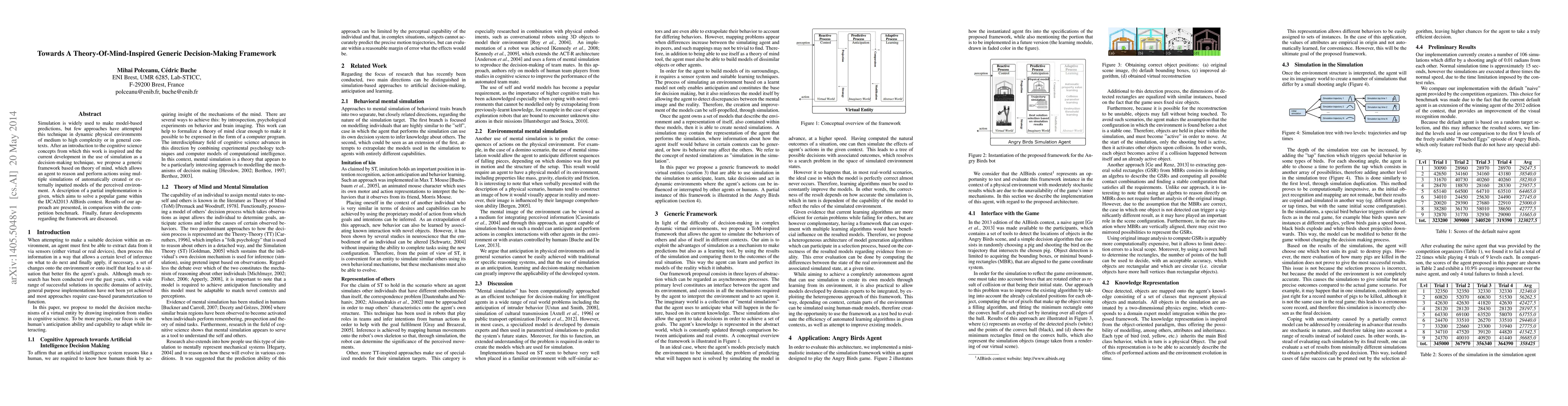 Researchers propose a generic decision-making framework inspired by theory of mind that uses multiple simulations to reason and act in dynamic environments, outperforming competition benchmark in a game within the IJCAI2013 AIBirds contest.