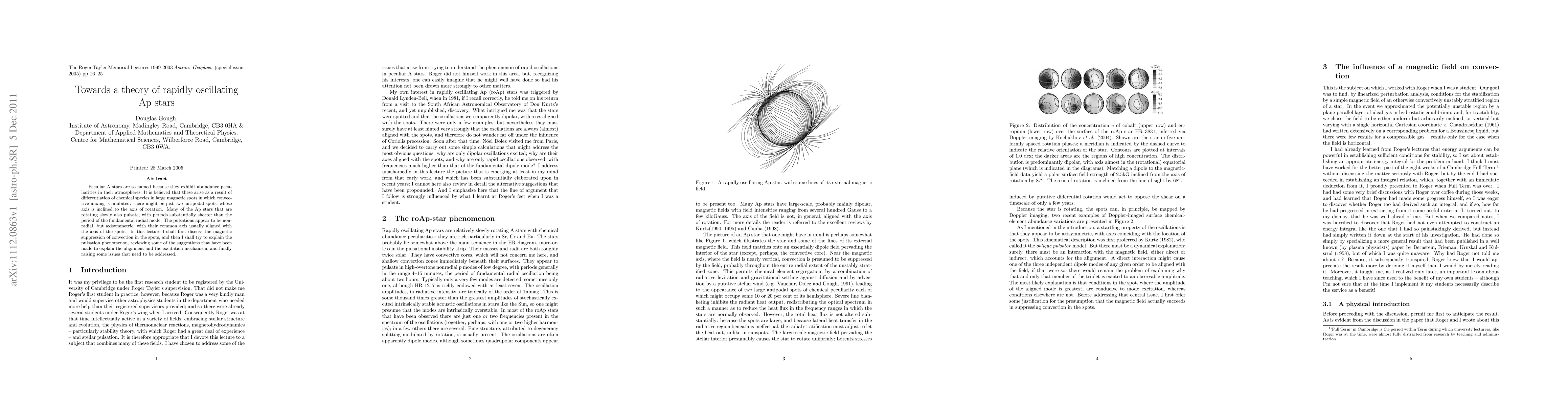 Peculiar A stars are so named because they exhibit abundance peculiarities in their atmospheres. It is believed that these arise as a result of differentiation of chemical species in large magnetic spots in which convective mixing is inhibited: there might be just two antipodal spots, whose axis is inclined to the axis of rotation. Many of the Ap stars that are rotating slowly also pulsate, with periods substantially shorter than the period of the fundamental radial mode. The pulsations appear to be nonradial, but axisymmetric, with their common axis usually aligned with the axis of the spots. In this lecture I shall first discuss the magnetic suppression of convection in the spots, and then I shall try to explain the pulsation phenomenon, reviewing some of the suggestions that have been made to explain the alignment and the excitation mechanism, and finally raising some issues that need to be addressed.
