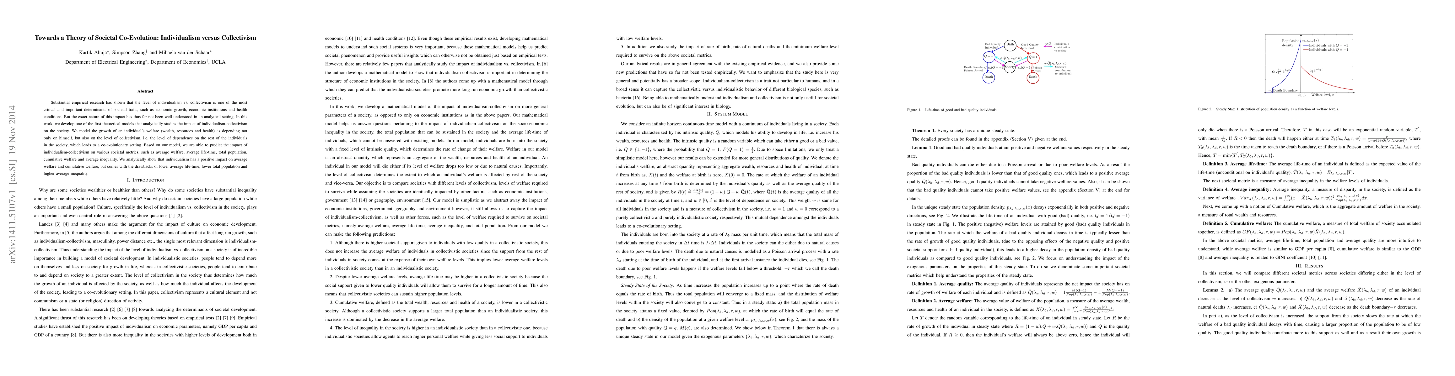 Substantial empirical research has shown that the level of individualism vs. collectivism is one of the most critical and important determinants of societal traits, such as economic growth, economic institutions and health conditions. But the exact nature of this impact has thus far not been well understood in an analytical setting. In this work, we develop one of the first theoretical models that analytically studies the impact of individualism-collectivism on the society. We model the growth of an individual's welfare (wealth, resources and health) as depending not only on himself, but also on the level of collectivism, i.e. the level of dependence on the rest of the individuals in the society, which leads to a co-evolutionary setting. Based on our model, we are able to predict the impact of individualism-collectivism on various societal metrics, such as average welfare, average life-time, total population, cumulative welfare and average inequality. We analytically show that individualism has a positive impact on average welfare and cumulative welfare, but comes with the drawbacks of lower average life-time, lower total population and higher average inequality.