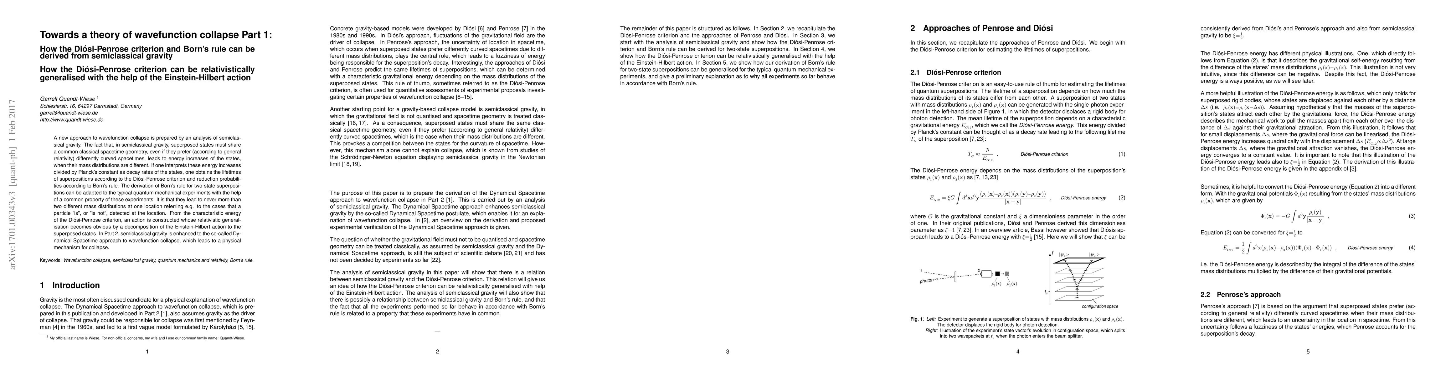 A new approach to wavefunction collapse is prepared by an analysis of semiclassical gravity. The fact that, in semiclassical gravity, superposed states must share a common classical spacetime geometry, even if they prefer (according to general relativity) differently curved spacetimes, leads to energy increases of the states, when their mass distributions are different. If one interprets these energy increases divided by Planck's constant as decay rates of the states, one obtains the lifetimes of superpositions according to the Diosi-Penrose criterion and reduction probabilities according to Born's rule. The derivation of Born's rule for two-state superpositions can be adapted to the typical quantum mechanical experiments with the help of a common property of these experiments. It is that they lead to never more than two different mass distributions at one location referring e.g. to the cases that a particle "is", or "is not", detected at the location. From the characteristic energy of the Diosi-Penrose criterion, an action is constructed whose relativistic generalisation becomes obvious by a decomposition of the Einstein-Hilbert action to the superposed states. In Part 2, semiclassical gravity is enhanced to the so-called Dynamical Spacetime approach to wavefunction collapse, which leads to a physical mechanism for collapse.