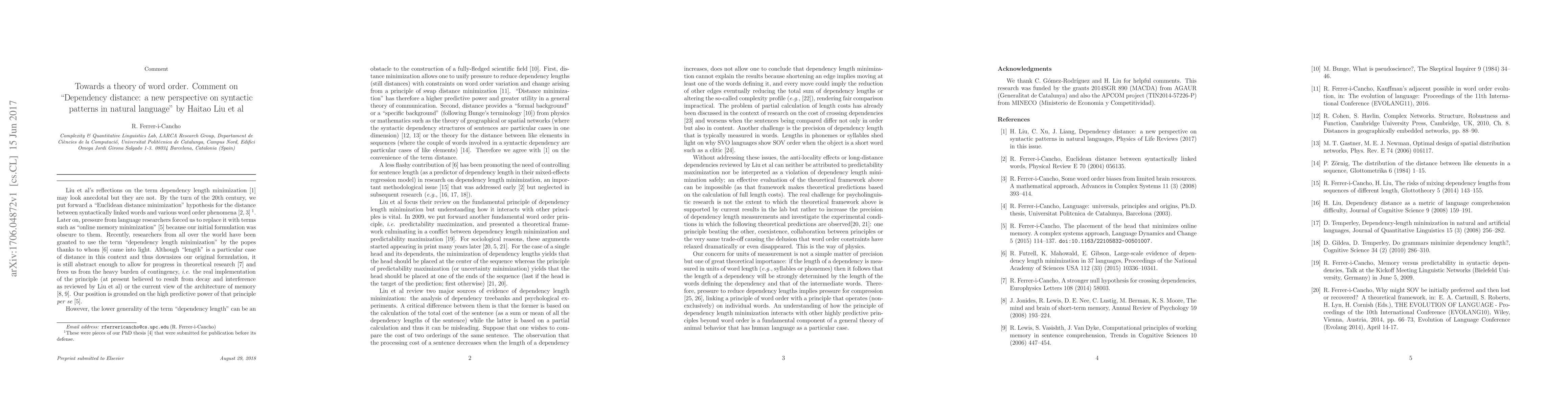 Comment on "Dependency distance: a new perspective on syntactic patterns in natural language" by Haitao Liu et al