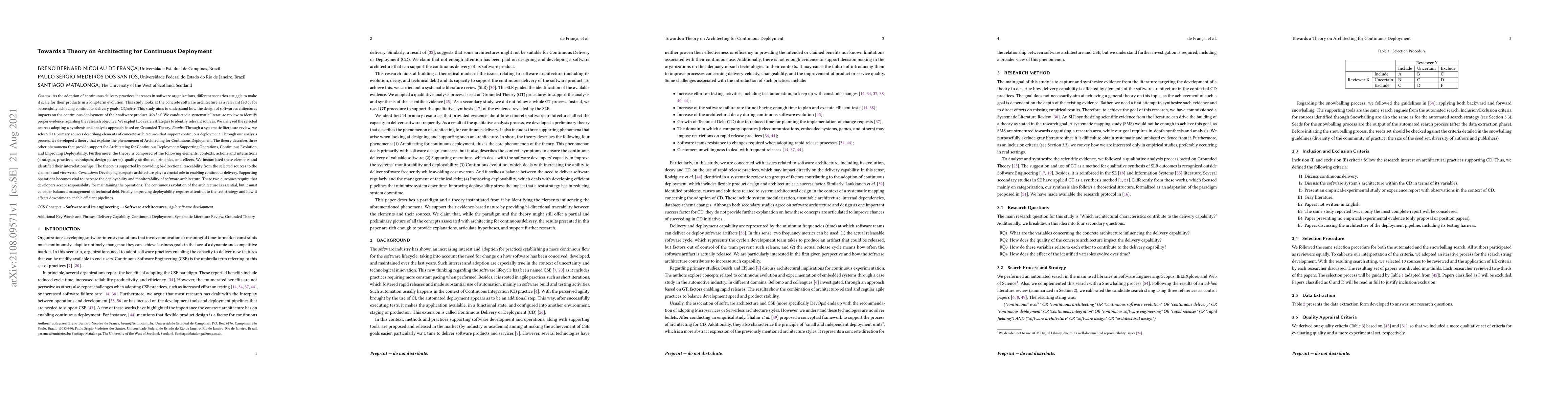 This study develops a theory on Architecting for Continuous Deployment, emphasizing that software architecture design significantly impacts continuous delivery. The theory identifies three supporting phenomena: Supporting Operations, Continuous Evolution, and Improving Deployability, and includes elements like contexts, actions, and interactions. The findings highlight the importance of architecture for enabling continuous delivery, stressing the need for operational support, balanced technical debt management, and effective test strategies.