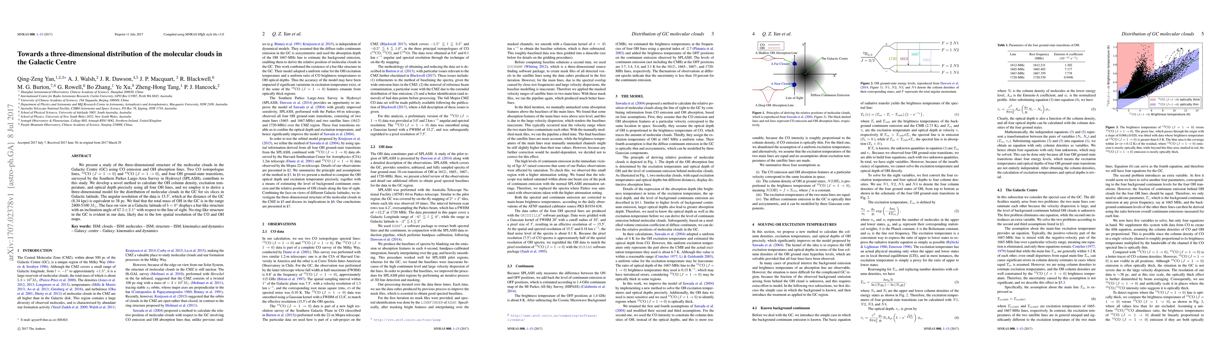 We present a study of the three-dimensional structure of the molecular clouds in the Galactic Centre (GC) using CO emission and OH absorption lines. Two CO isotopologue lines, $^{12}$CO ($J$=1$\rightarrow$0) and $^{13}$CO ($J$=1$\rightarrow$0), and four OH ground-state transitions, surveyed by the Southern Parkes Large-Area Survey in Hydroxyl (SPLASH), contribute to this study. We develop a novel method to calculate the OH column density, excitation temperature, and optical depth precisely using all four OH lines, and we employ it to derive a three-dimensional model for the distribution of molecular clouds in the GC for six slices in Galactic latitude. The angular resolution of the data is 15.5 arcmin, which at the distance of the GC (8.34 kpc) is equivalent to 38 pc. We find that the total mass of OH in the GC is in the range 2400-5100 Solar mass . The face-on view at a Galactic latitude of b = 0{\deg} displays a bar-like structure with an inclination angle of 67.5 $\pm$ 2.1{\deg} with respect to the line of sight. No ring-like structure in the GC is evident in our data, likely due to the low spatial resolution of the CO and OH maps.