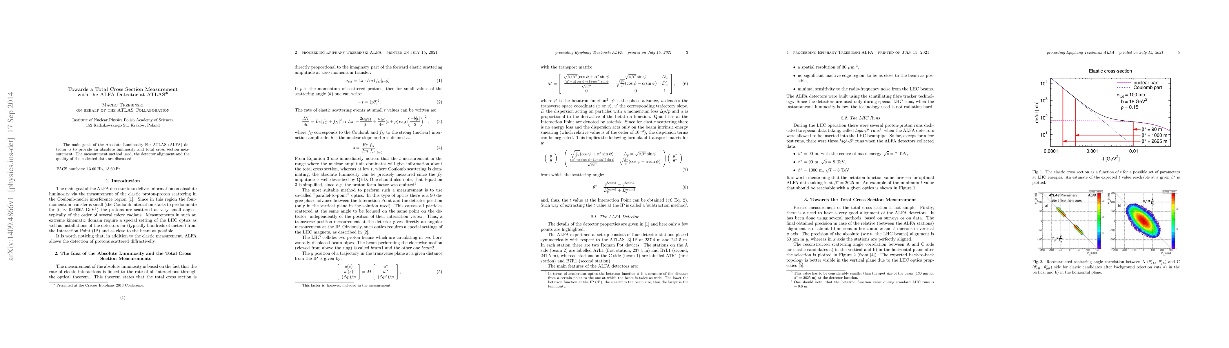 Summary: The ALFA detector in the ATLAS experiment aims to measure absolute luminosity and total cross section, detailing the measurement method, detector alignment, and data quality. The study emphasizes the detector's precision and calibration for accurate results.