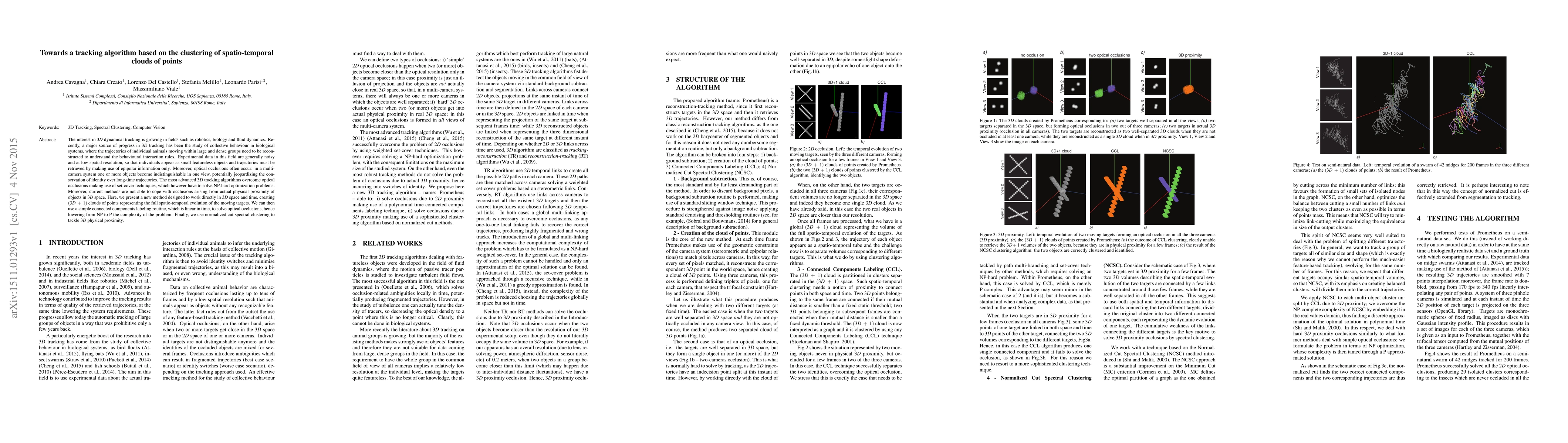 The interest in 3D dynamical tracking is growing in fields such as robotics, biology and fluid dynamics. Recently, a major source of progress in 3D tracking has been the study of collective behaviour in biological systems, where the trajectories of individual animals moving within large and dense groups need to be reconstructed to understand the behavioural interaction rules. Experimental data in this field are generally noisy and at low spatial resolution, so that individuals appear as small featureless objects and trajectories must be retrieved by making use of epipolar information only. Moreover, optical occlusions often occur: in a multi-camera system one or more objects become indistinguishable in one view, potentially jeopardizing the conservation of identity over long-time trajectories. The most advanced 3D tracking algorithms overcome optical occlusions making use of set-cover techniques, which however have to solve NP-hard optimization problems. Moreover, current methods are not able to cope with occlusions arising from actual physical proximity of objects in 3D space. Here, we present a new method designed to work directly in 3D space and time, creating (3D+1) clouds of points representing the full spatio-temporal evolution of the moving targets. We can then use a simple connected components labeling routine, which is linear in time, to solve optical occlusions, hence lowering from NP to P the complexity of the problem. Finally, we use normalized cut spectral clustering to tackle 3D physical proximity.
