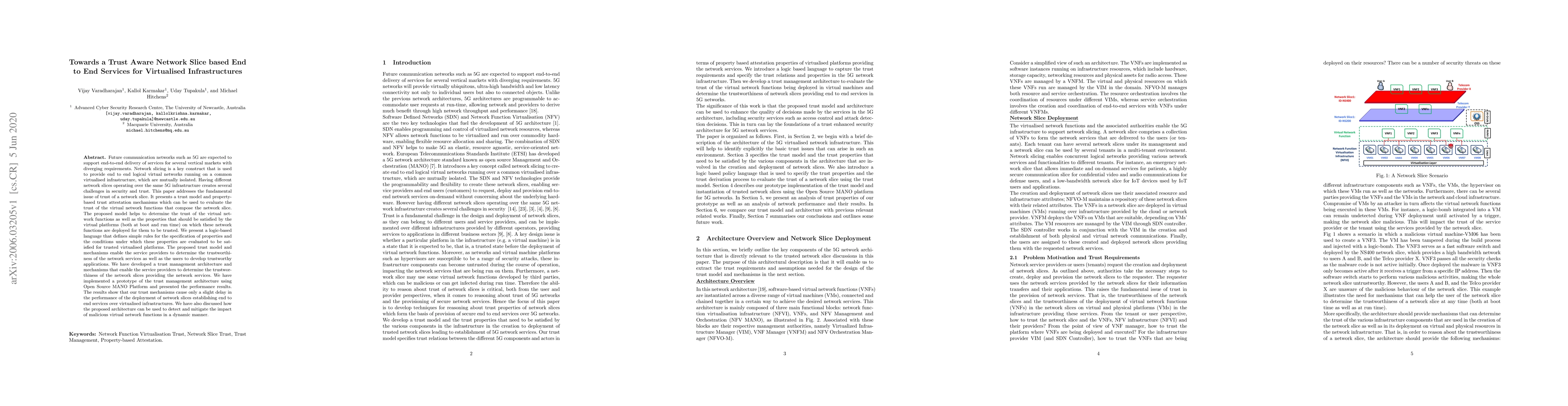 Future communication networks such as 5G are expected to support end-to-end delivery of services for several vertical markets with diverging requirements. Network slicing is a key construct that is used to provide end to end logical virtual networks running on a common virtualised infrastructure, which are mutually isolated. Having different network slices operating over the same 5G infrastructure creates several challenges in security and trust. This paper addresses the fundamental issue of trust of a network slice. It presents a trust model and property-based trust attestation mechanisms which can be used to evaluate the trust of the virtual network functions that compose the network slice. The proposed model helps to determine the trust of the virtual network functions as well as the properties that should be satisfied by the virtual platforms (both at boot and run time) on which these network functions are deployed for them to be trusted. We present a logic-based language that defines simple rules for the specification of properties and the conditions under which these properties are evaluated to be satisfied for trusted virtualised platforms. The proposed trust model and mechanisms enable the service providers to determine the trustworthiness of the network services as well as the users to develop trustworthy applications. .