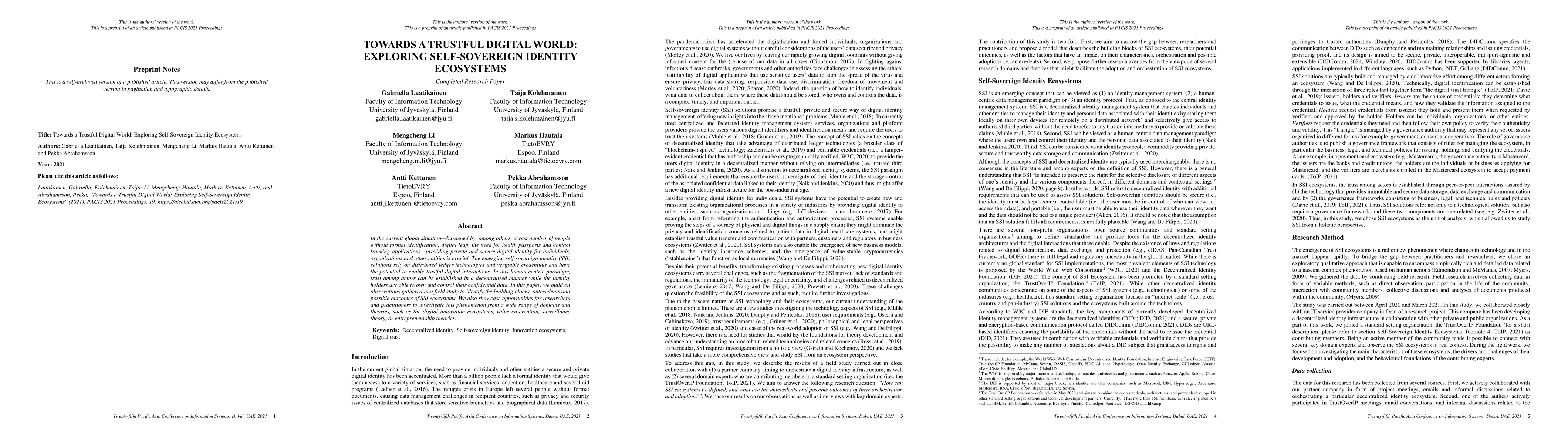 In the current global situation-burdened by, among others, a vast number of people without formal identification, digital leap, the need for health passports and contact tracking applications-providing private and secure digital identity for individuals, organizations and other entities is crucial. The emerging self-sovereign identity (SSI) solutions rely on distributed ledger technologies and verifiable credentials and have the potential to enable trustful digital interactions. In this human-centric paradigm, trust among actors can be established in a decentralized manner while the identity holders are able to own and control their confidential data. In this paper, we build on observations gathered in a field study to identify the building blocks, antecedents and possible outcomes of SSI ecosystems. We also showcase opportunities for researchers and practitioners to investigate this phenomenon from a wide range of domains and theories, such as the digital innovation ecosystems, value co-creation, surveillance theory, or entrepreneurship theories.