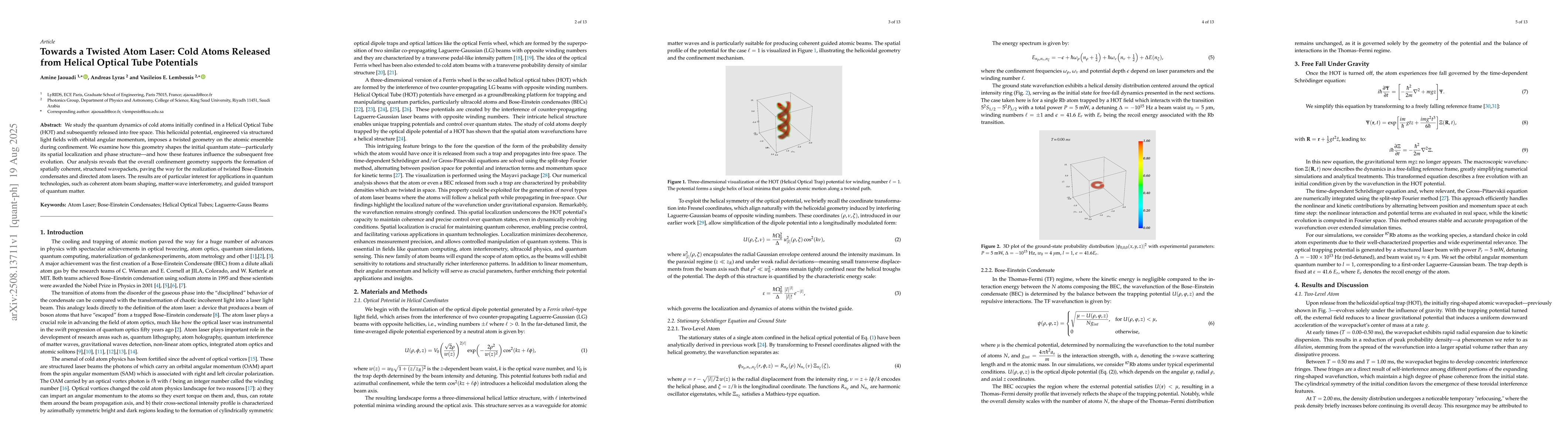 We study the quantum dynamics of cold atoms initially confined in a Helical Optical Tube (HOT) and subsequently released into free space. This helicoidal potential, engineered via structured light fields with orbital angular momentum, imposes a twisted geometry on the atomic ensemble during confinement. We examine how this geometry shapes the initial quantum state particularly its spatial localization and phase structure and how these features influence the subsequent free evolution. Our analysis reveals that the overall confinement geometry supports the formation of spatially coherent, structured wavepackets, paving the way for the realization of twisted Bose Einstein condensates and directed atom lasers. The results are of particular interest for applications in quantum technologies, such as coherent atom beam shaping, matter-wave interferometry, and guided transport of quantum matter.