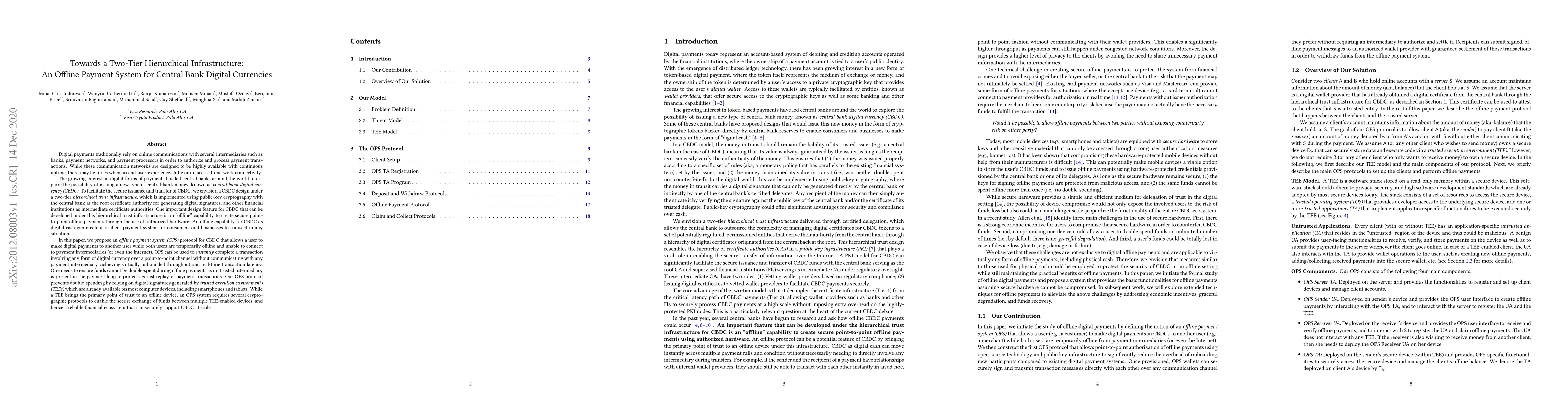 This paper proposes a two-tier hierarchical infrastructure for central bank digital currencies (CBDC) featuring offline payment capabilities. It introduces an offline payment system (OPS) protocol that enables secure point-to-point transactions without requiring internet connectivity, leveraging public-key cryptography and a central bank as the root certificate authority.