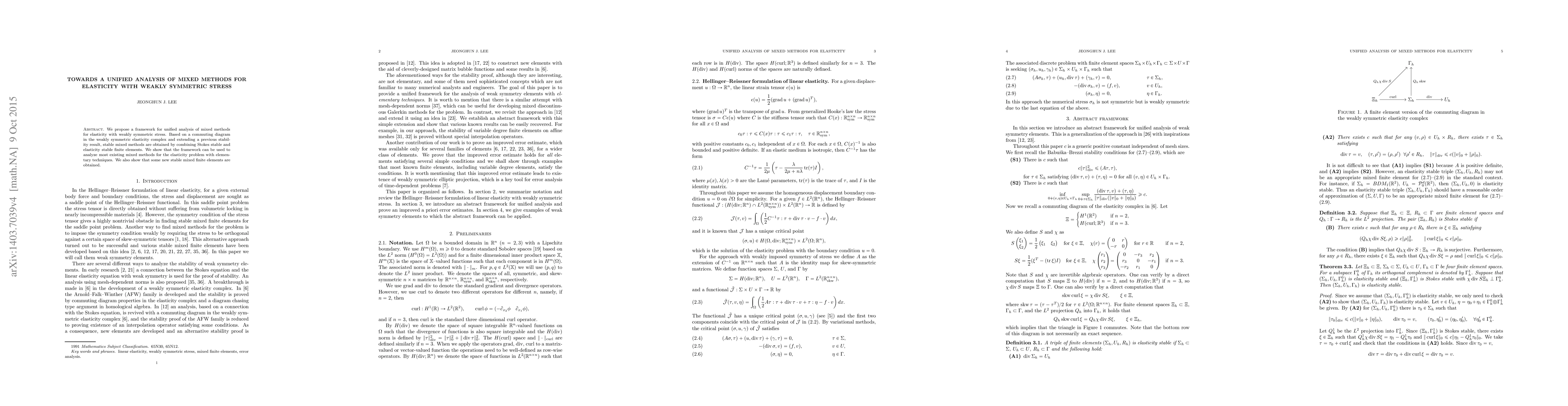 This paper proposes a unified framework for analyzing mixed methods in elasticity with weakly symmetric stress, combining Stokes stable and elasticity stable finite elements to achieve stable mixed methods. The framework is shown to analyze existing methods and derive new stable mixed finite elements.