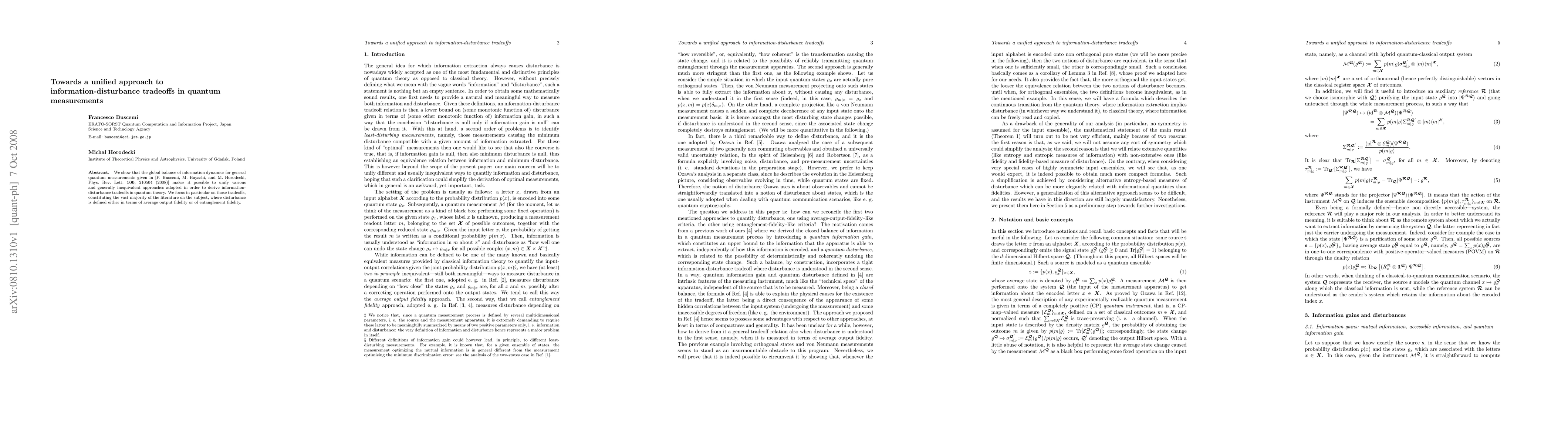 This paper unifies various approaches to information-disturbance tradeoffs in quantum measurements, showing that the global balance of information dynamics allows for a consistent framework. It particularly addresses tradeoffs defined by average or entanglement fidelity.