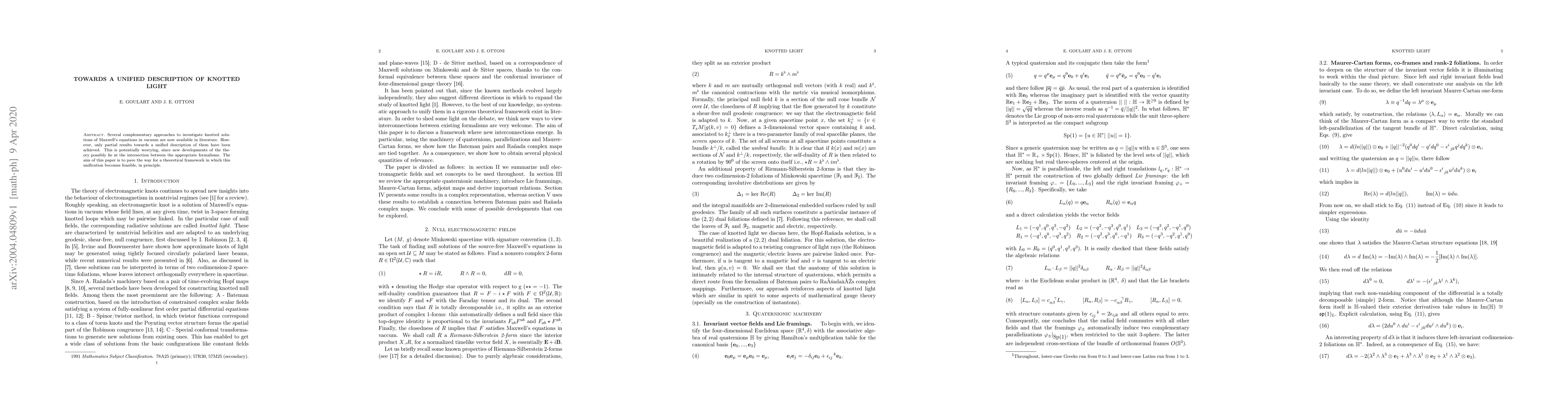 This paper seeks to develop a unified theoretical framework for understanding knotted solutions of Maxwell's equations in vacuum, aiming to integrate various complementary approaches and potentially unlock new theoretical developments at their intersection.