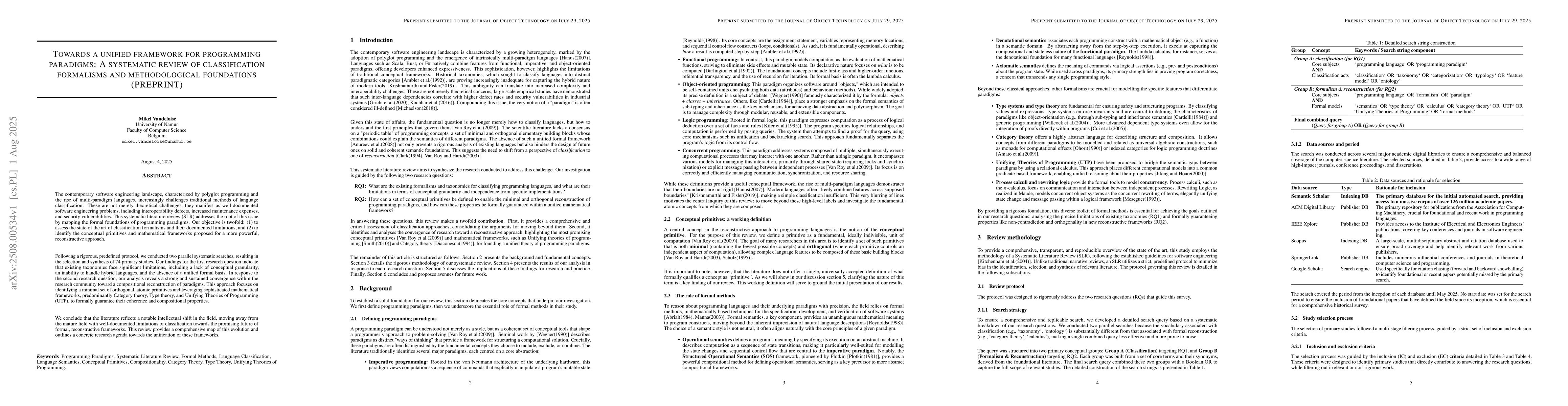 The rise of multi-paradigm languages challenges traditional classification methods, leading to practical software engineering issues like interoperability defects. This systematic literature review (SLR) maps the formal foundations of programming paradigms. Our objective is twofold: (1) to assess the state of the art of classification formalisms and their limitations, and (2) to identify the conceptual primitives and mathematical frameworks for a more powerful, reconstructive approach. Based on a synthesis of 74 primary studies, we find that existing taxonomies lack conceptual granularity, a unified formal basis, and struggle with hybrid languages. In response, our analysis reveals a strong convergence toward a compositional reconstruction of paradigms. This approach identifies a minimal set of orthogonal, atomic primitives and leverages mathematical frameworks, predominantly Type theory, Category theory and Unifying Theories of Programming (UTP), to formally guarantee their compositional properties. We conclude that the literature reflects a significant intellectual shift away from classification towards these promising formal, reconstructive frameworks. This review provides a map of this evolution and proposes a research agenda for their unification.