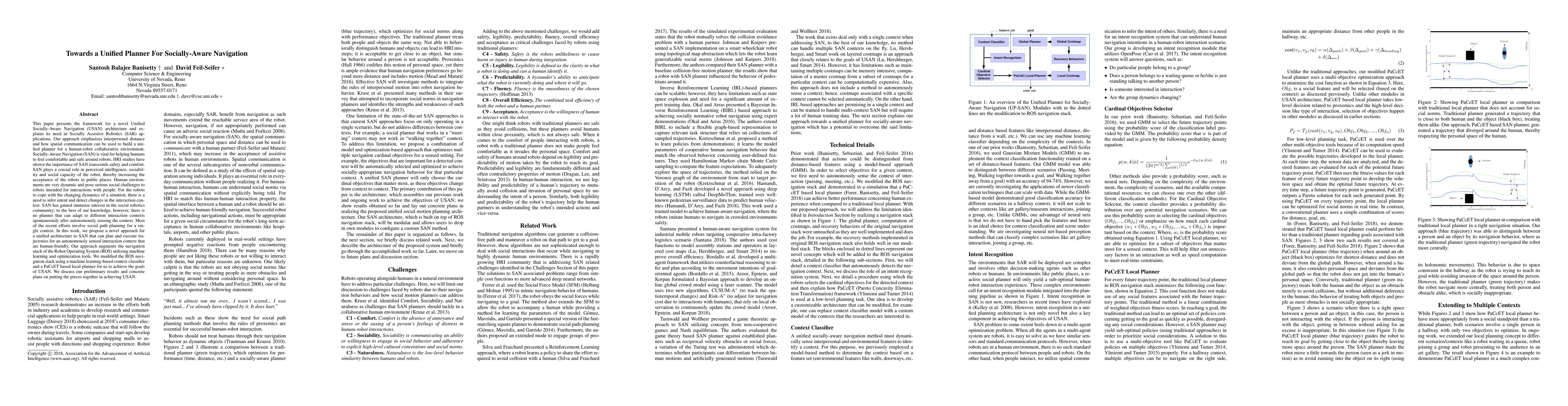 This paper presents the framework for a novel Unified Socially-Aware Navigation (USAN) architecture and explains its need in Socially Assistive Robotics (SAR) applications. Our approach emphasizes interpersonal distance and how spatial communication can be used to build a unified planner for a human-robot collaborative environment. Socially-Aware Navigation (SAN) is vital for helping humans to feel comfortable and safe around robots; HRI studies have shown the importance of SAN transcends safety and comfort. SAN plays a crucial role in perceived intelligence, sociability and social capacity of the robot, thereby increasing the acceptance of the robots in public places. Human environments are very dynamic and pose serious social challenges to robots intended for interactions with people. For the robots to cope with the changing dynamics of a situation, there is a need to infer intent and detect changes in the interaction context. SAN has gained immense interest in the social robotics community; to the best of our knowledge, however, there is no planner that can adapt to different interaction contexts spontaneously after autonomously sensing the context. Most of the recent efforts involve social path planning for a single context. In this work, we propose a novel approach for a unified architecture to SAN that can plan and execute trajectories for an autonomously sensed interaction context that are human-friendly. Our approach augments the navigation stack of the Robot Operating System (ROS) utilizing machine learning and optimization tools. We modified the ROS navigation stack using a machine learning-based context classifier and a PaCcET based local planner for us to achieve the goals of USAN. We discuss our preliminary results and concrete plans on putting the pieces together in achieving USAN.