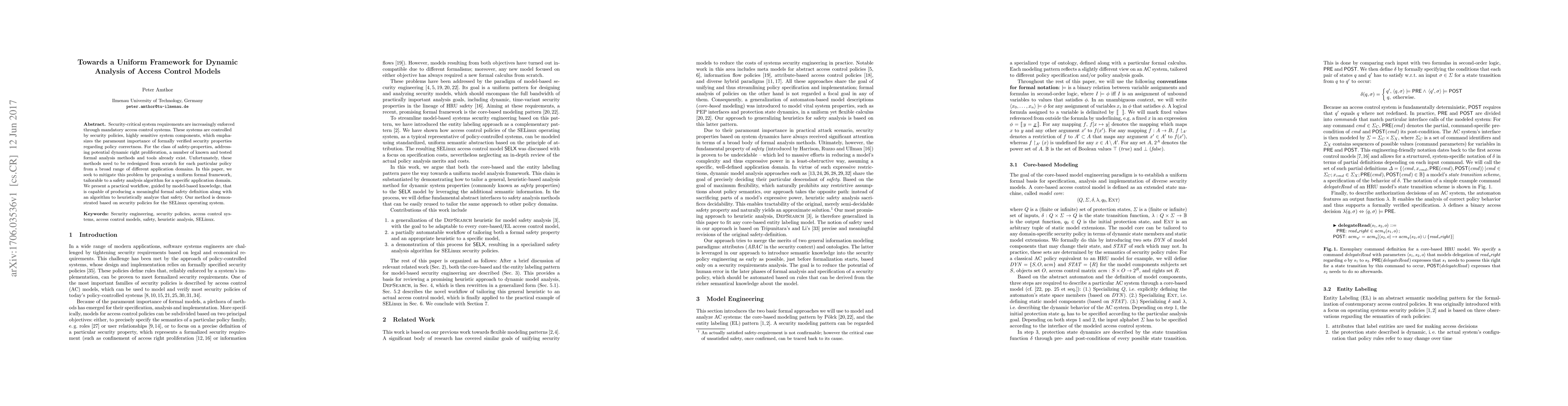 This paper proposes a uniform formal framework for dynamically analyzing access control models, aiming to address the need for tailored safety analysis across various application domains. The authors demonstrate their method through a practical workflow and heuristic analysis applied to security policies in the SELinux operating system.