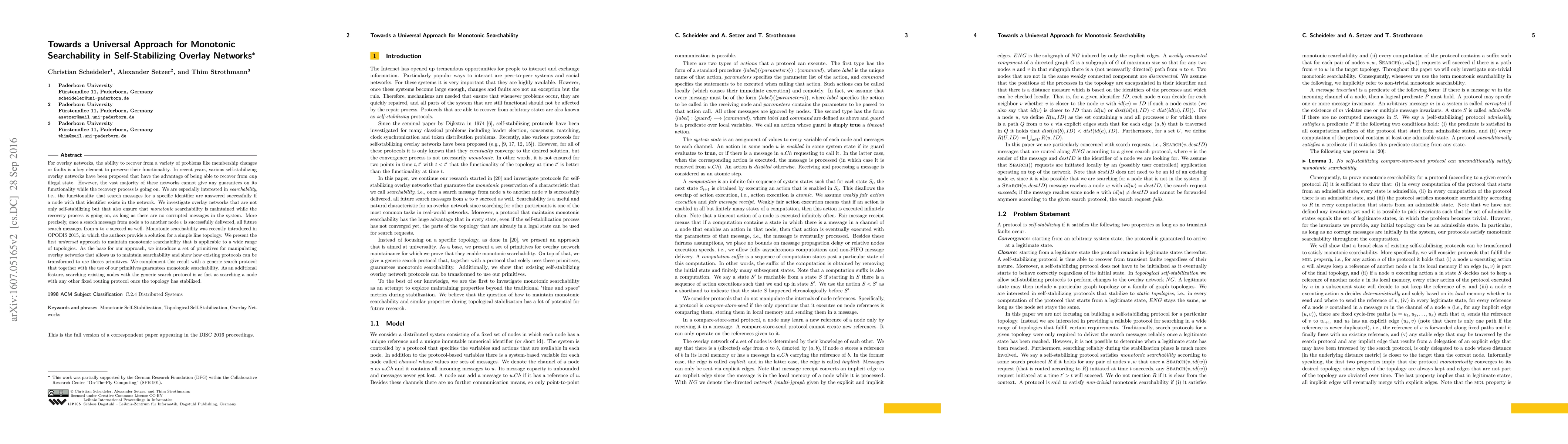 This paper proposes a universal approach to maintain monotonic searchability in self-stabilizing overlay networks, ensuring successful search message delivery even during recovery processes. It introduces a set of primitives and a generic search protocol to guarantee monotonic searchability across various network topologies.