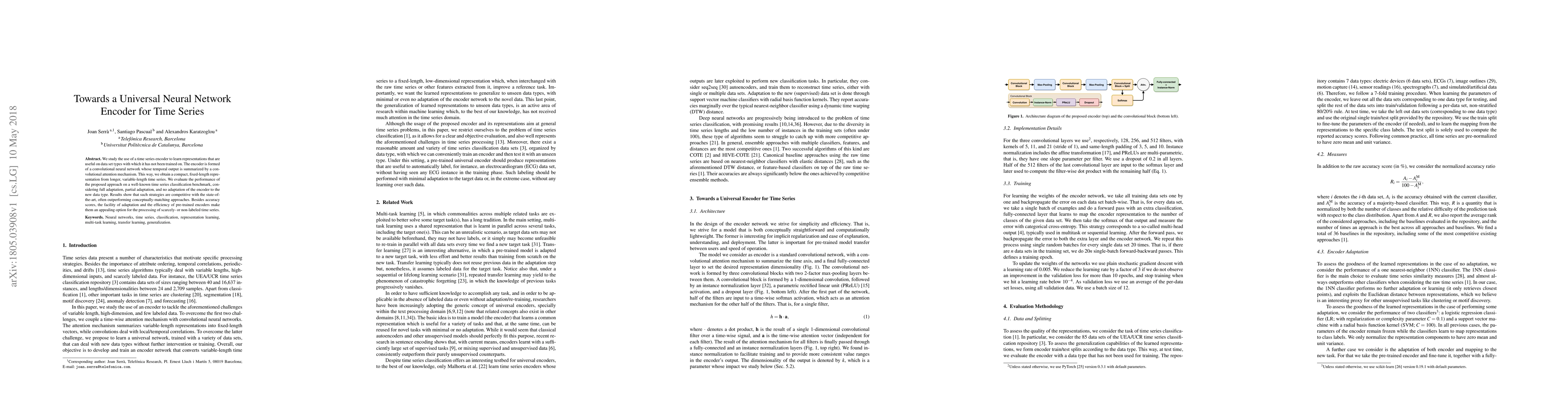 We study the use of a time series encoder to learn representations that are useful on data set types with which it has not been trained on. The encoder is formed of a convolutional neural network whose temporal output is summarized by a convolutional attention mechanism. This way, we obtain a compact, fixed-length representation from longer, variable-length time series. We evaluate the performance of the proposed approach on a well-known time series classification benchmark, considering full adaptation, partial adaptation, and no adaptation of the encoder to the new data type. Results show that such strategies are competitive with the state-of-the-art, often outperforming conceptually-matching approaches. Besides accuracy scores, the facility of adaptation and the efficiency of pre-trained encoders make them an appealing option for the processing of scarcely- or non-labeled time series.