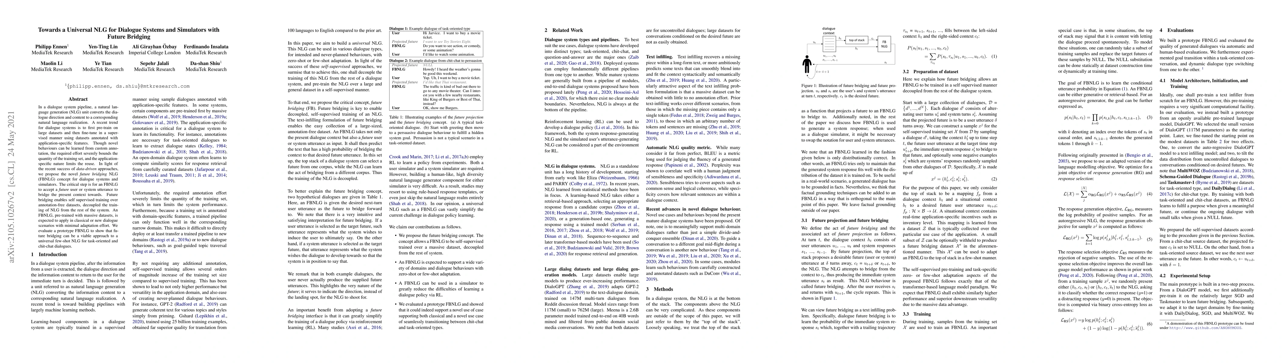 In a dialogue system pipeline, a natural language generation (NLG) unit converts the dialogue direction and content to a corresponding natural language realization. A recent trend for dialogue systems is to first pre-train on large datasets and then fine-tune in a supervised manner using datasets annotated with application-specific features. Though novel behaviours can be learned from custom annotation, the required effort severely bounds the quantity of the training set, and the application-specific nature limits the reuse. In light of the recent success of data-driven approaches, we propose the novel future bridging NLG (FBNLG) concept for dialogue systems and simulators. The critical step is for an FBNLG to accept a future user or system utterance to bridge the present context towards. Future bridging enables self supervised training over annotation-free datasets, decoupled the training of NLG from the rest of the system. An FBNLG, pre-trained with massive datasets, is expected to apply in classical or new dialogue scenarios with minimal adaptation effort. We evaluate a prototype FBNLG to show that future bridging can be a viable approach to a universal few-shot NLG for task-oriented and chit-chat dialogues.