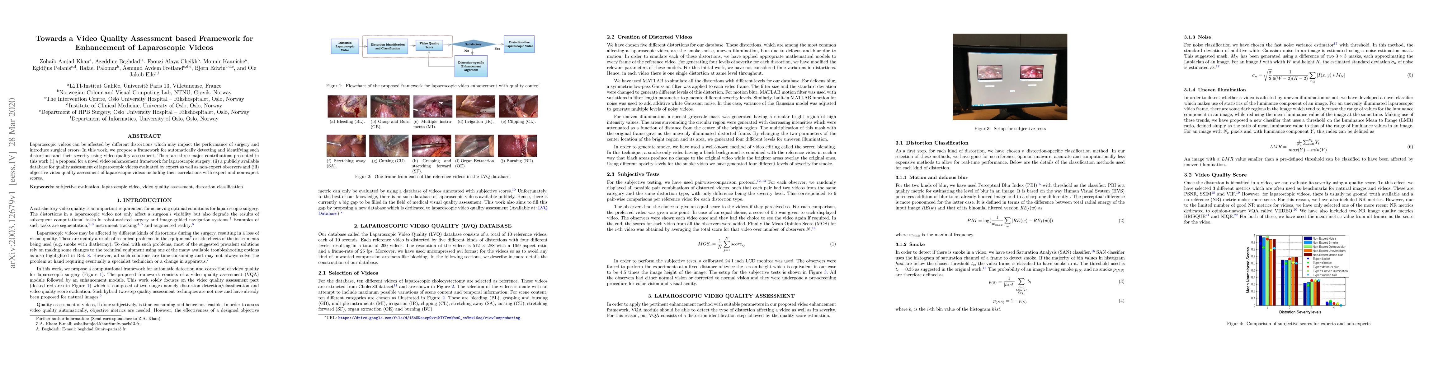 This paper proposes a framework for detecting and assessing distortions in laparoscopic videos to enhance surgical precision. It introduces a new video enhancement framework, a publicly available assessment database, and an objective video quality assessment correlated with expert and non-expert observations.