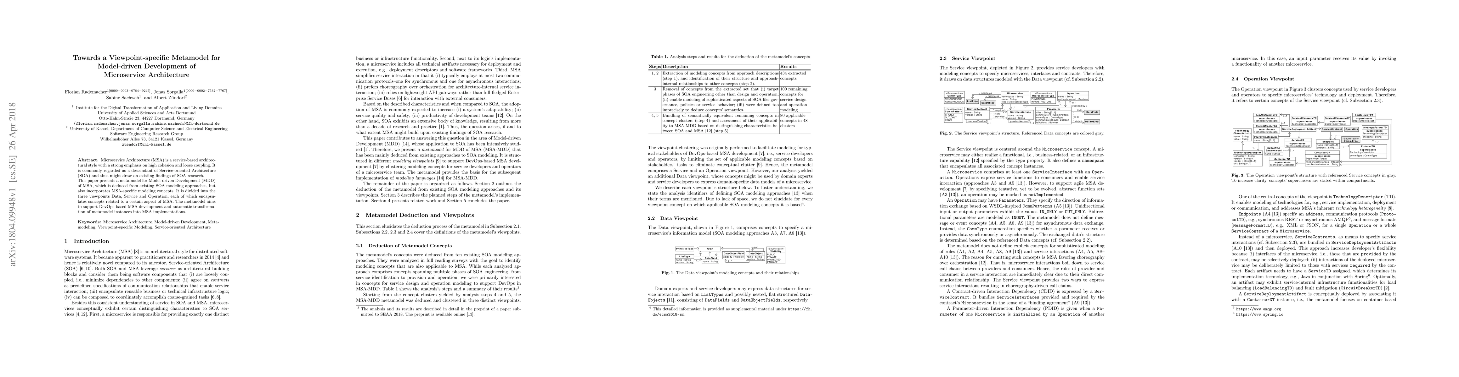 Microservice Architecture (MSA) is a service-based architectural style with a strong emphasis on high cohesion and loose coupling. It is commonly regarded as a descendant of Service-oriented Architecture (SOA) and thus might draw on existing findings of SOA research. This paper presents a metamodel for Model-driven Development (MDD) of MSA, which is deduced from existing SOA modeling approaches, but also incorporates MSA-specific modeling concepts. It is divided into the three viewpoints Data, Service and Operation, each of which encapsulates concepts related to a certain aspect of MSA. The metamodel aims to support DevOps-based MSA development and automatic transformation of metamodel instances into MSA implementations.