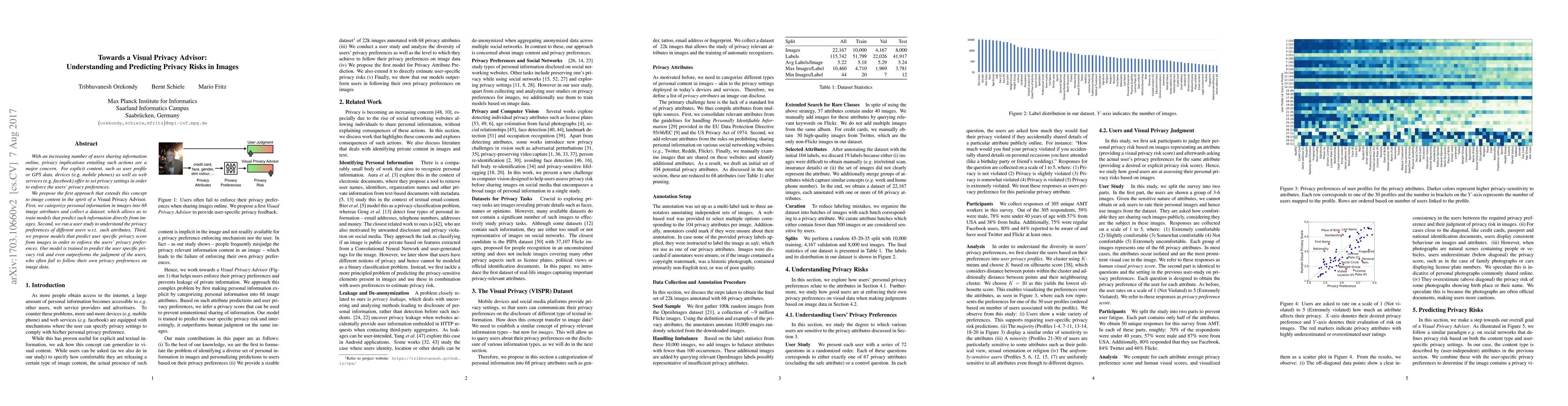 This paper proposes a Visual Privacy Advisor to predict privacy risks in images by categorizing 68 image attributes and training models to detect them. It also assesses user privacy preferences through a study and develops models to predict user-specific privacy scores, outperforming users' self-assessments.